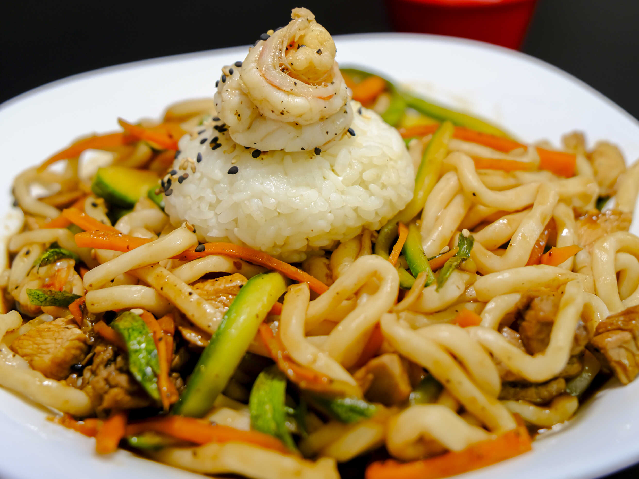Pasta estilo nudles, con verdura a la juliana. aderezado con kushiage. soya adicional.