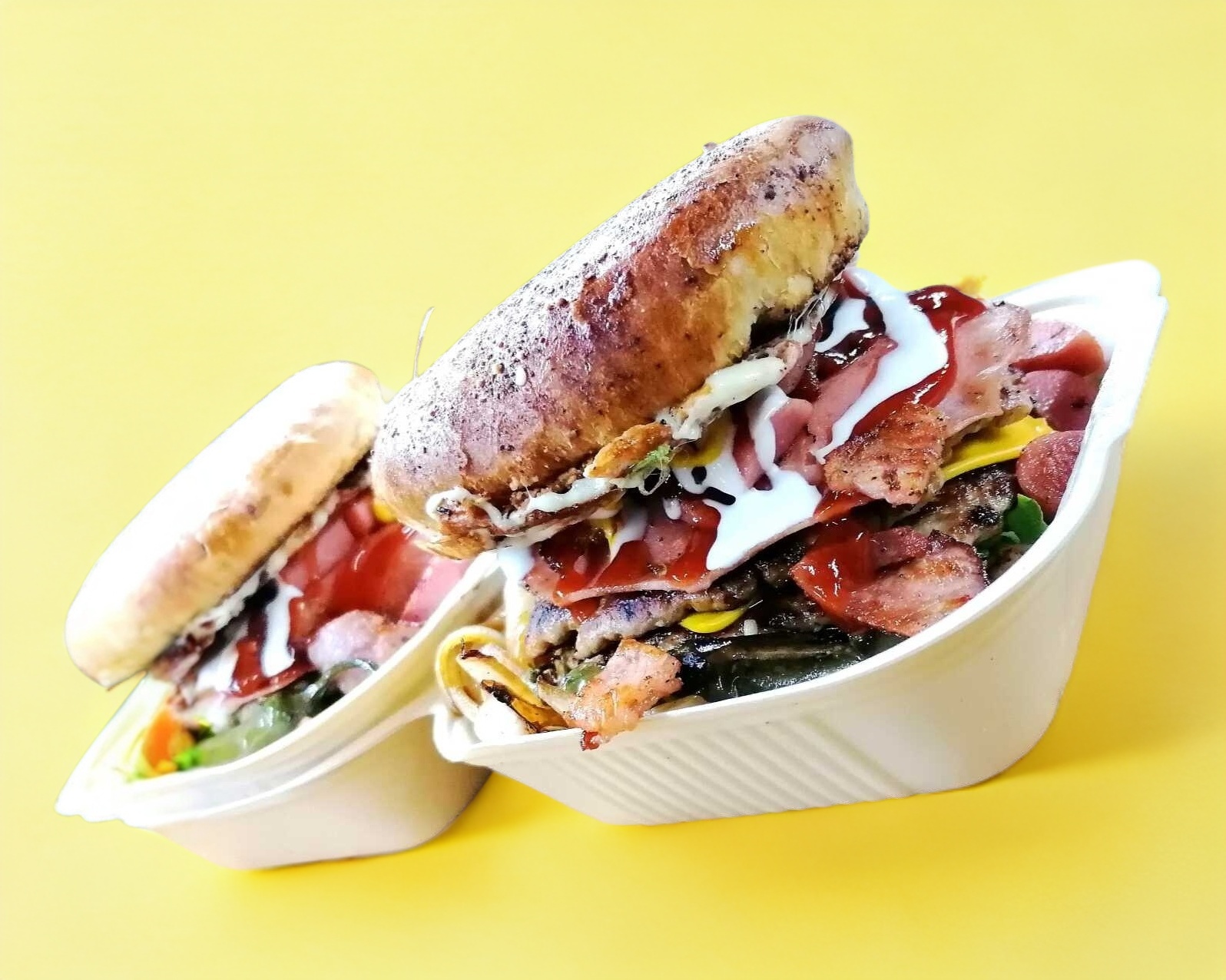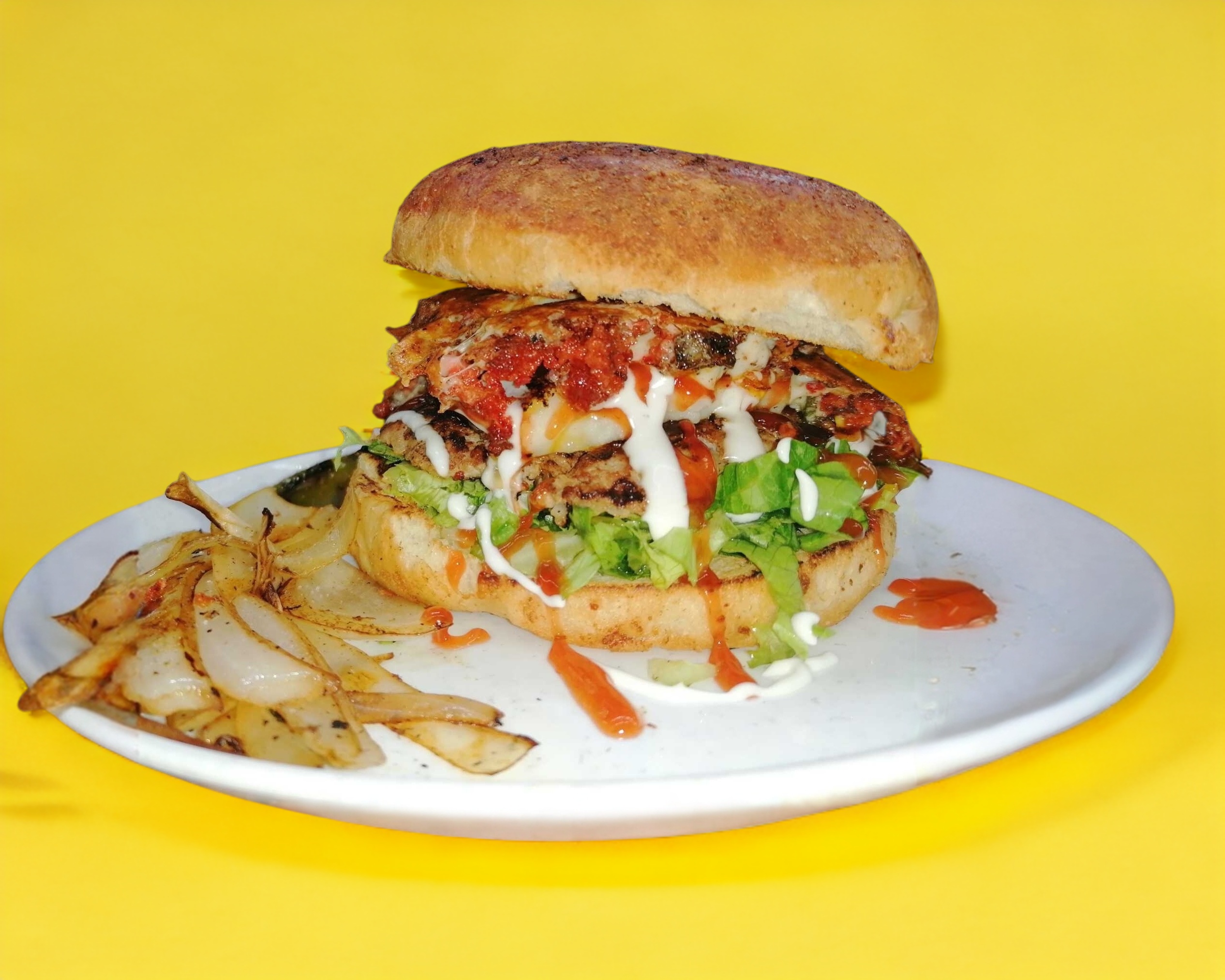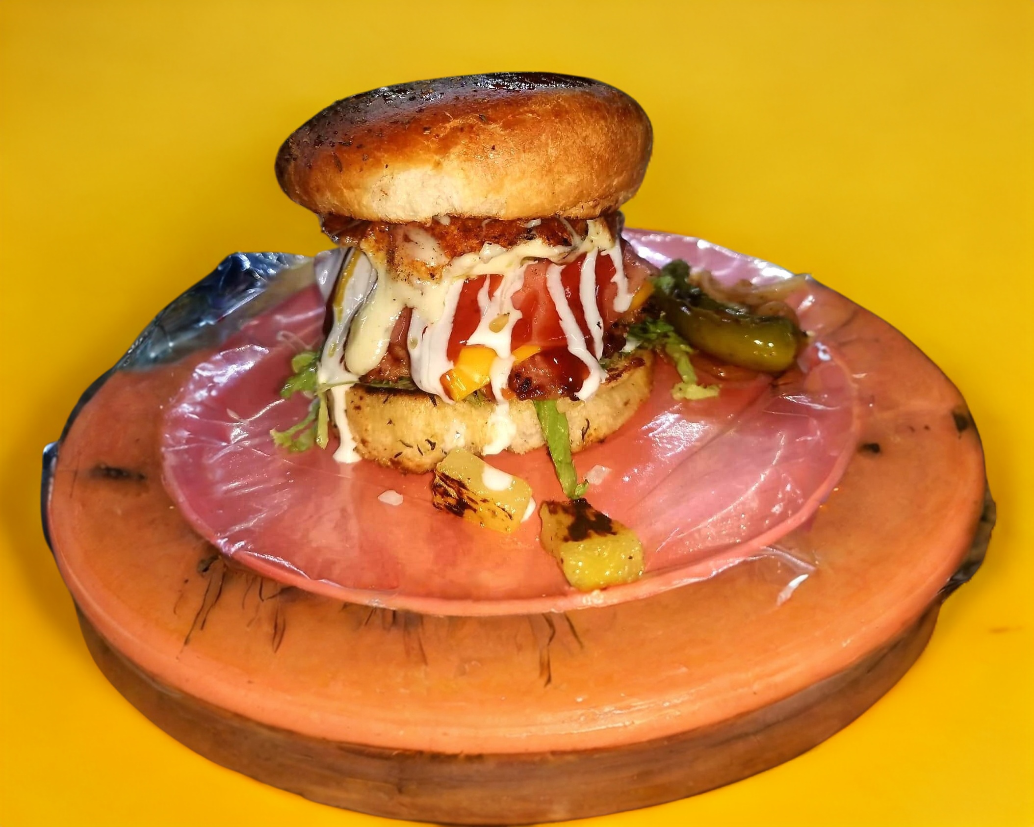 Carne de Res, Tocino, Piña, Queso Amarillo, Queso Asadero, Puré de Papa, Lechuga, Jitomate, Cebolla, Cátsup, Crema, Mostaza, Aderezo Chipotle, Chile Toreado & Cebolla Asada.