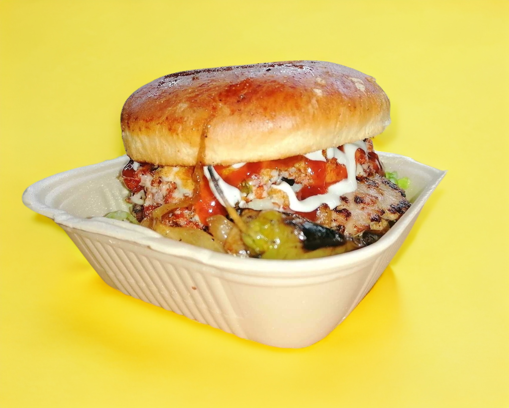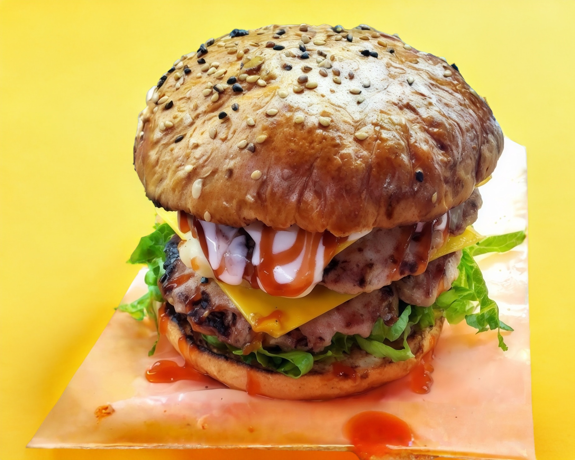 Doble Carne de Res, Doble Queso Amarillo, Puré de Papa, Lechuga, Jitomate, Cebolla, Catsup, Crema, Mostaza, Chipotle.