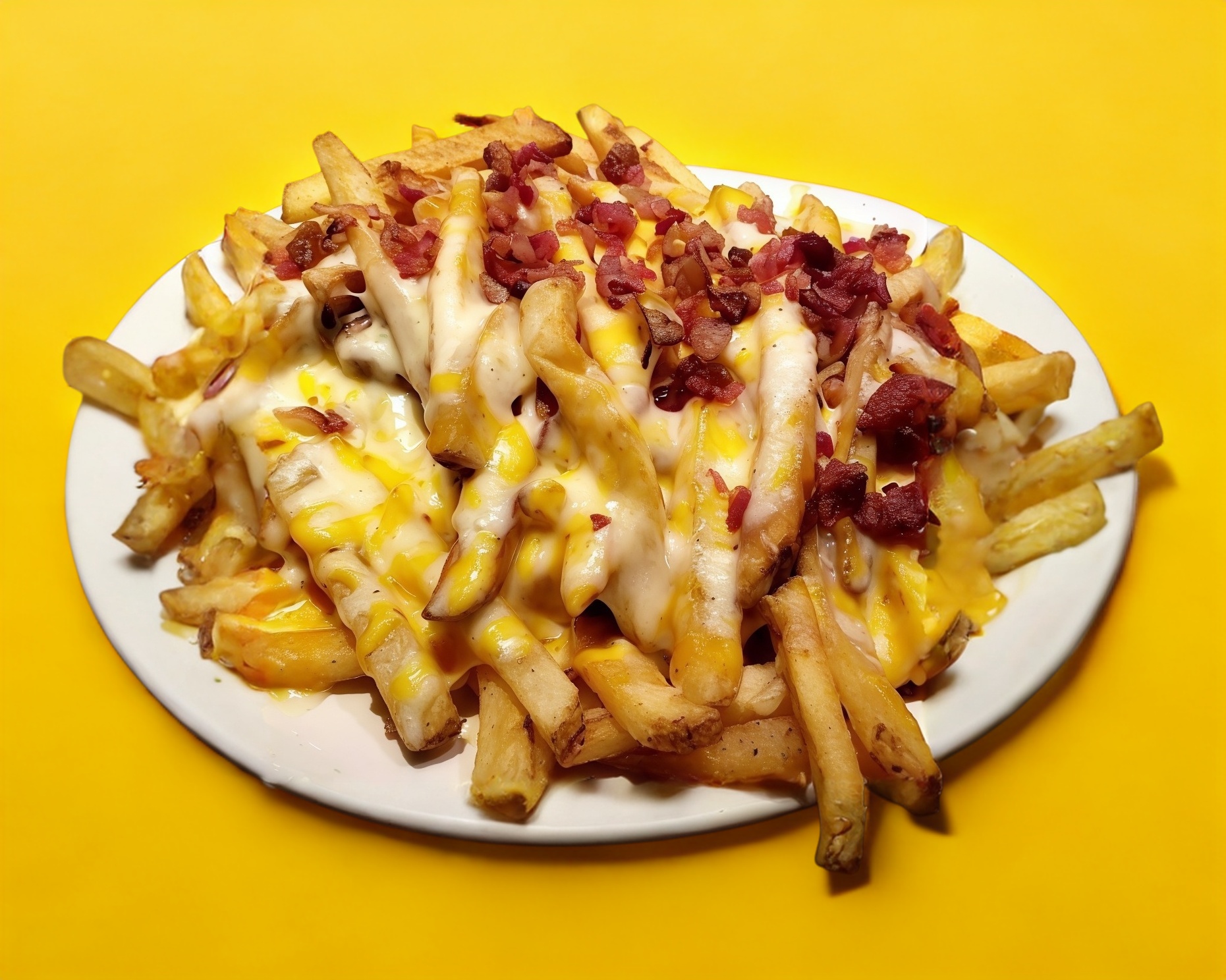 Papas a la Francesa, Carne de Res en Trozos, Tocino, Queso Asadero, Catsup, Crema, Mostaza, Chipotle.