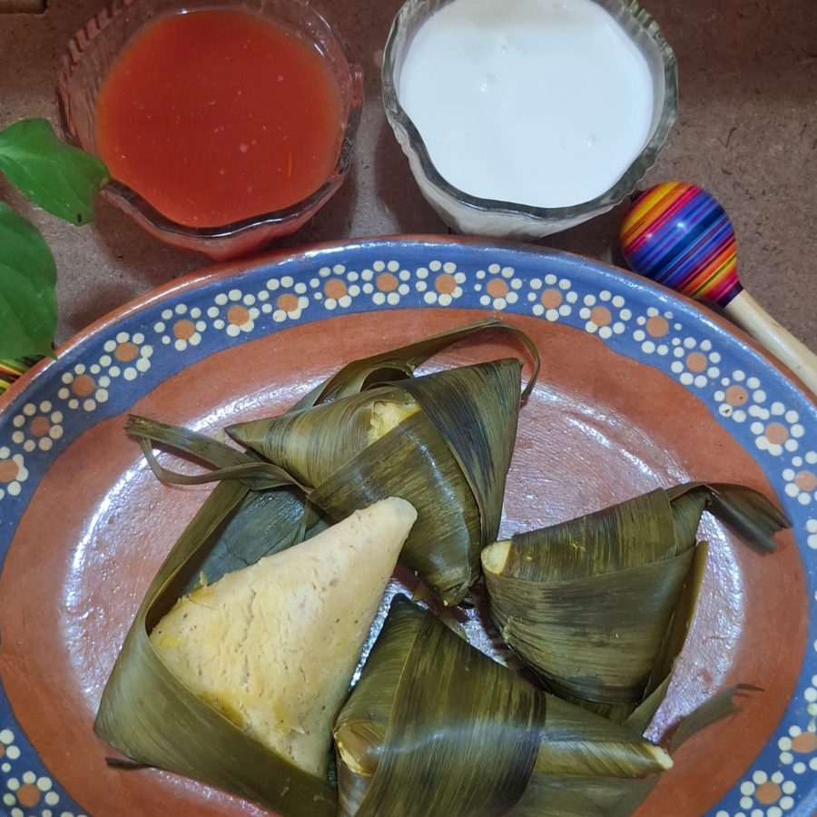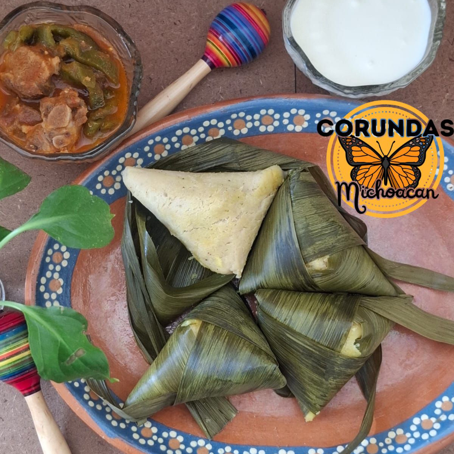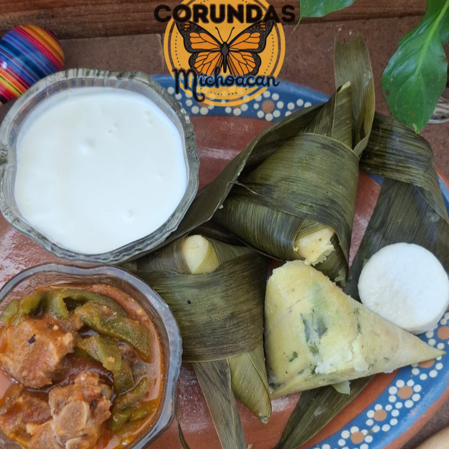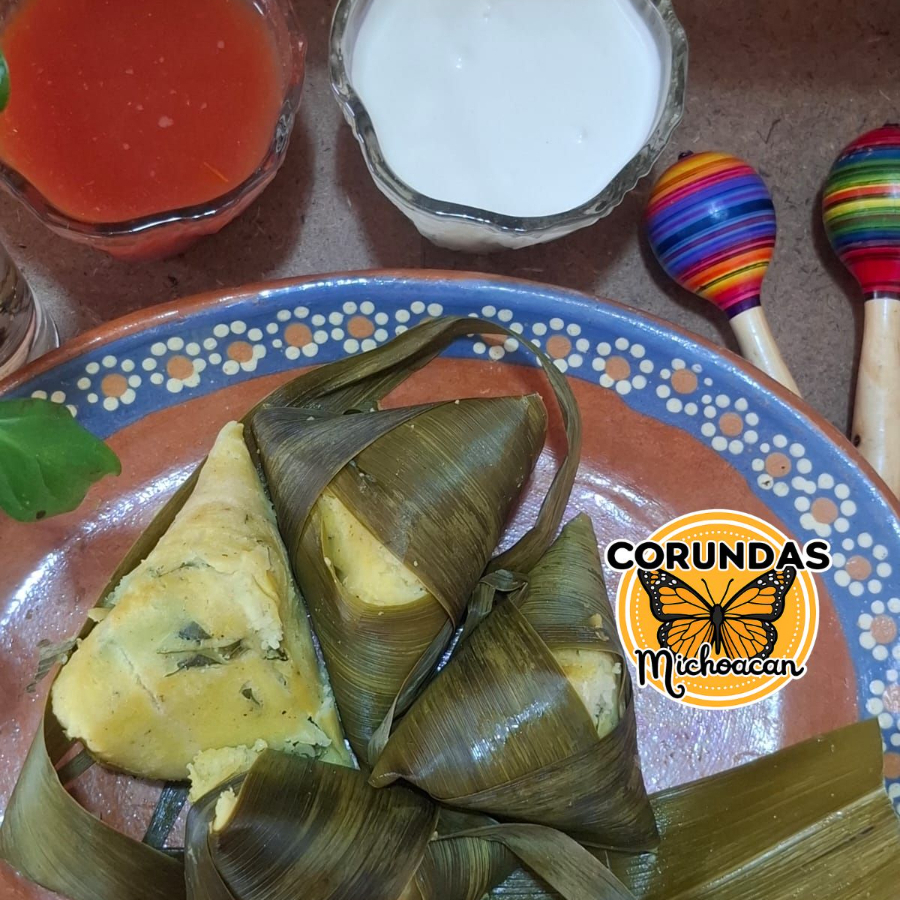 Cuatro corundas de manteca acompañadas de salsa tradicional y crema natural.