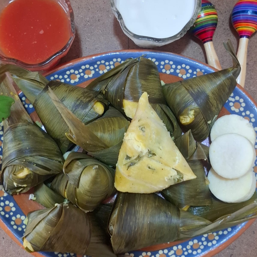 Cuatro corundas de manteca rellenas de acelgas acompañadas de salsa tradicional y crema natural.