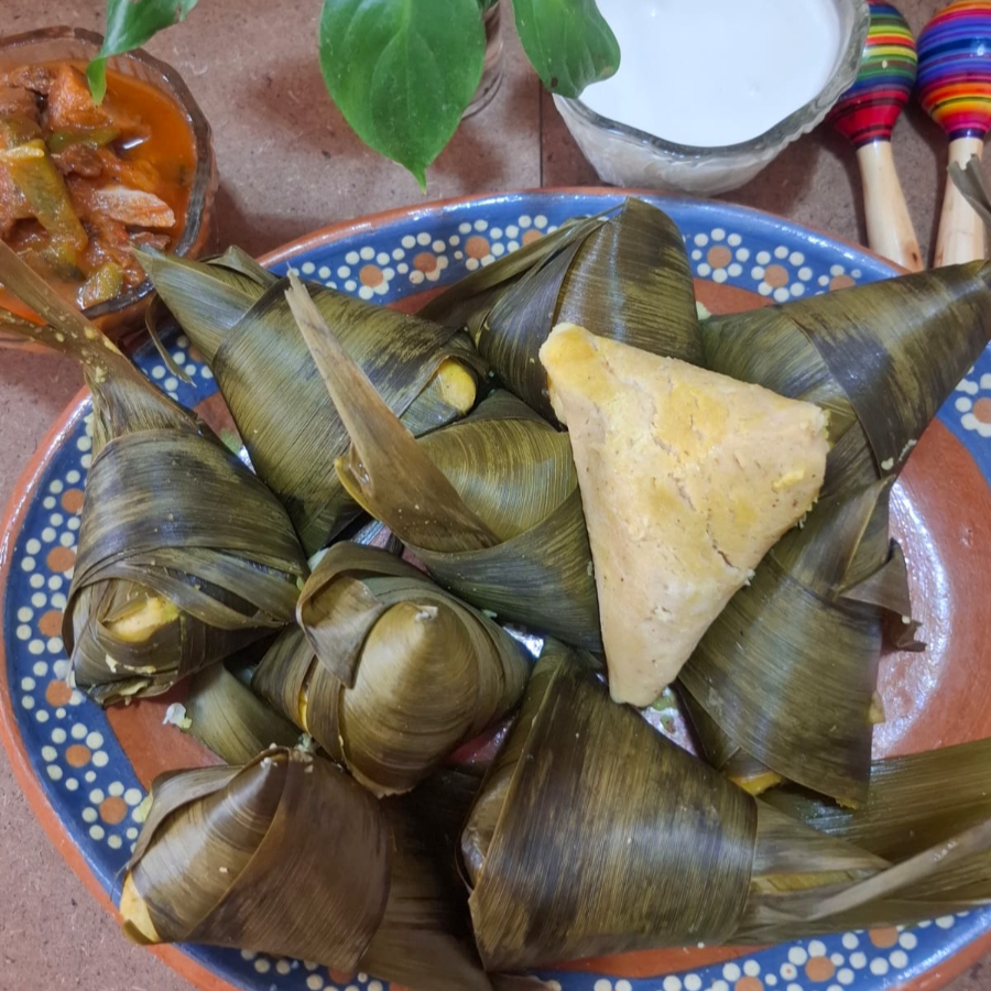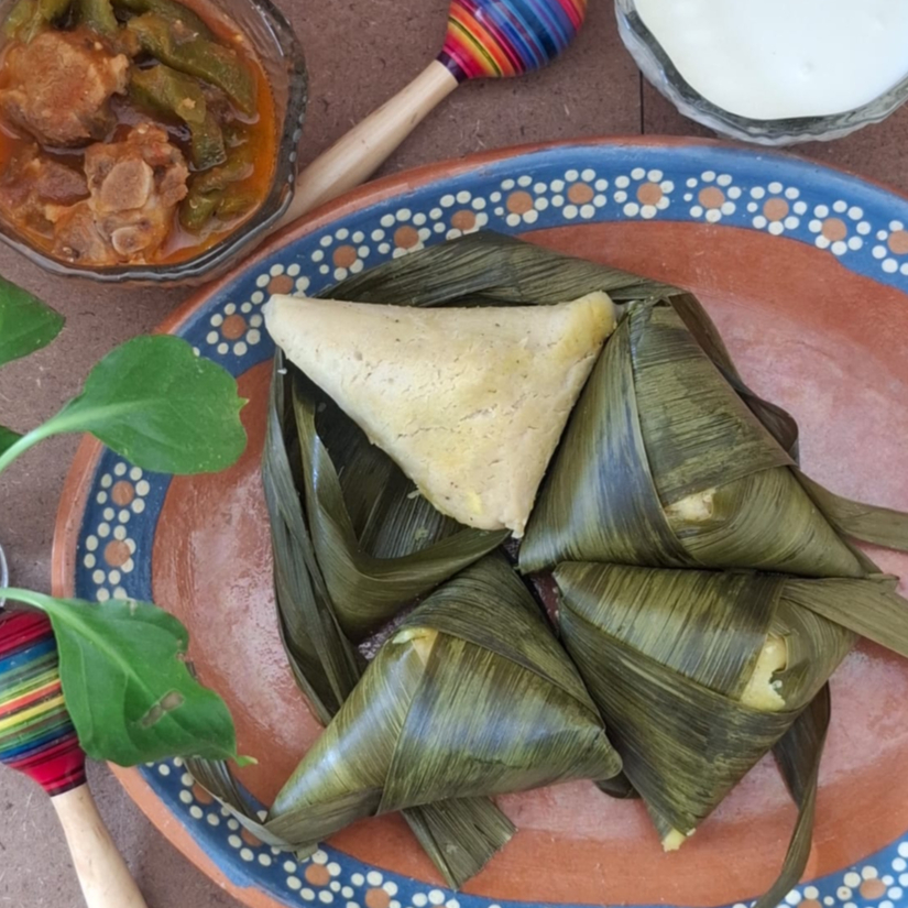 Cuatro corundas de manteca acompañadas de costilla de puerco guisada en salsa con rajas y crema natural.