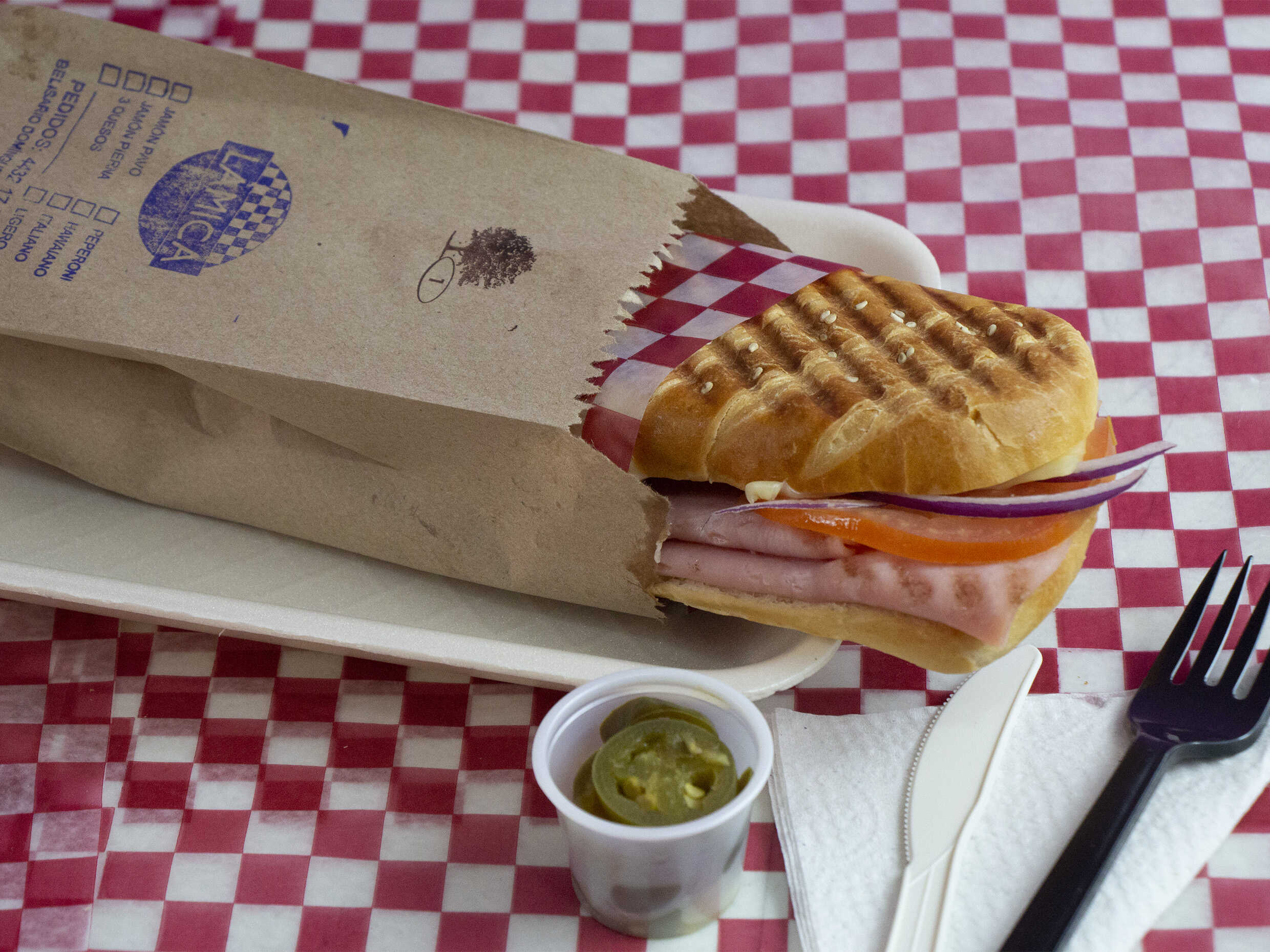 Jamón de pavo, queso manchego, jitomate, cebolla korada y jalapeño.
