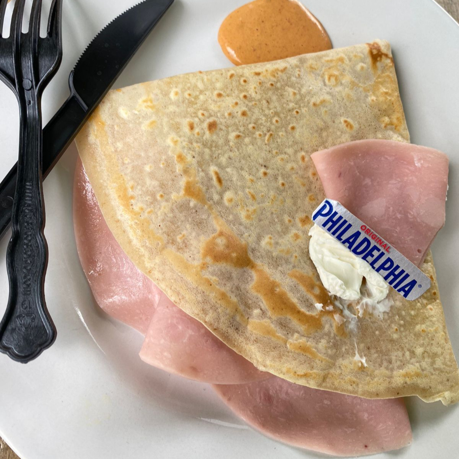 Deliciosa Crepa elaborada con masa casera, jamón de pavo y queso Philadelphia, acompañado con aderezo de chipotle