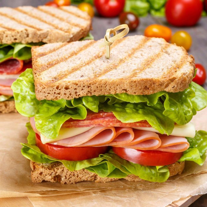 Delicioso sandwich elaborado con pan de 12 granos o mantequilla, con jamon de pavo, mayonesa, queso manchego, lechuga italiana, jitomate, pepino, cebolla. Acompañado con aderezo de chipotle