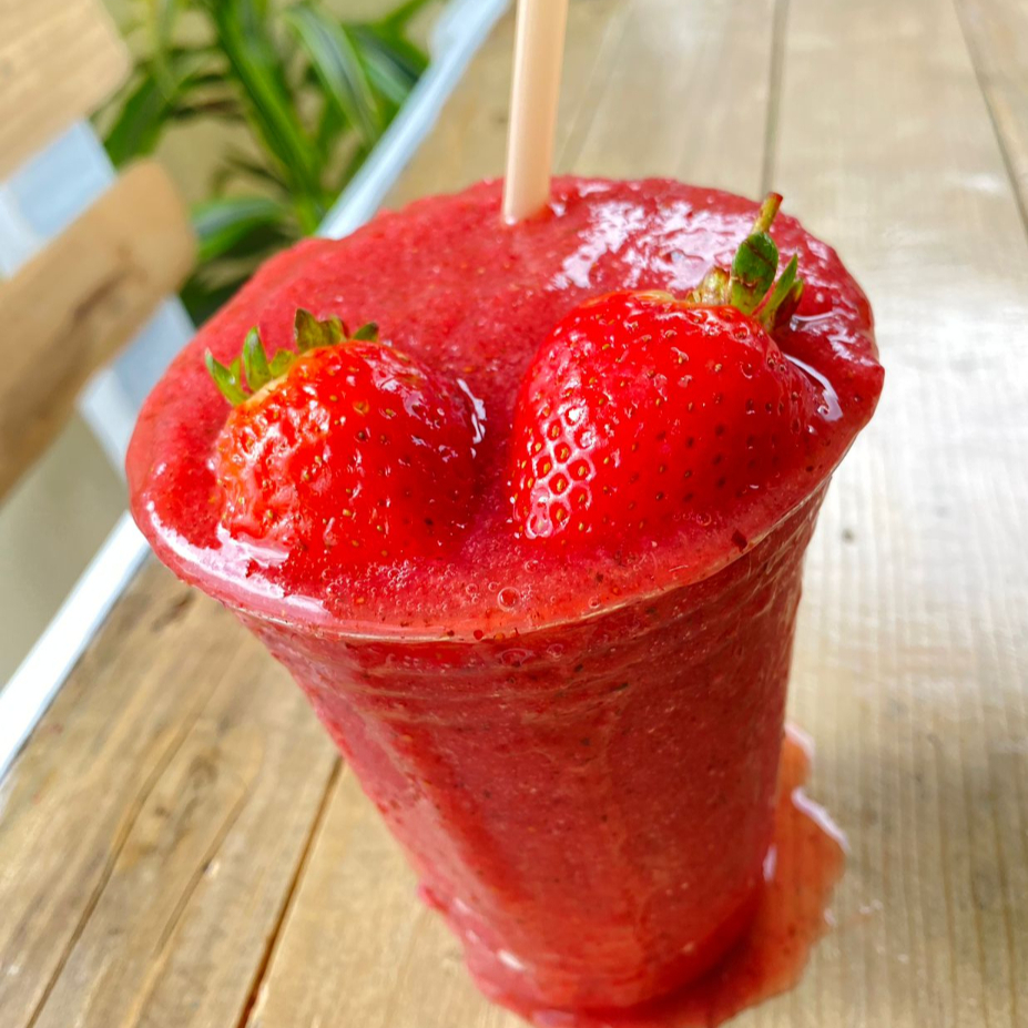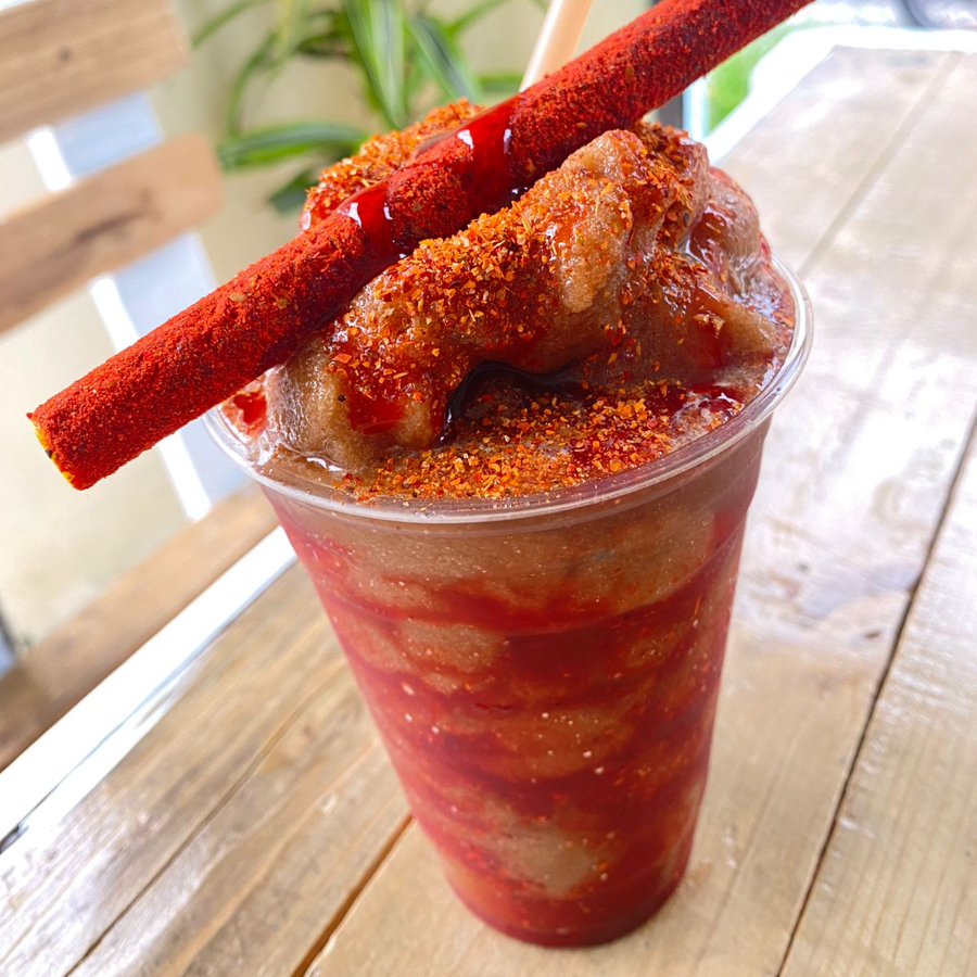 Diablito de pulpa de fresa natural endulzado con chamoy,tajin y taguro de tamarindo