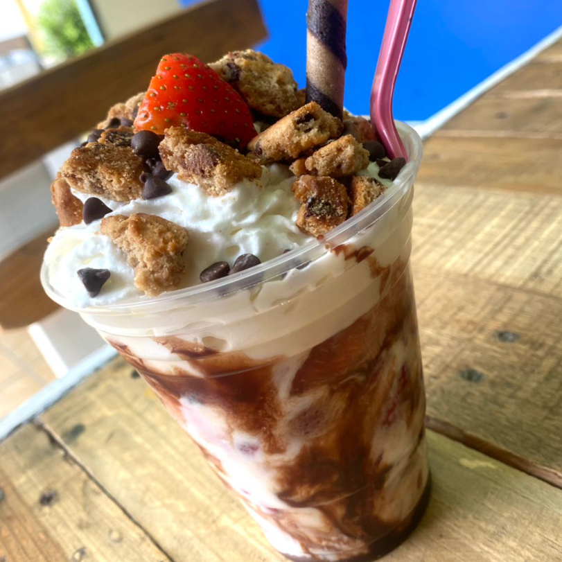 Deliciosa fresa natural fresca con crema hecha por la casa, vaso decorado con chocolate Hershey, crema batida, galletas de chocolate trituradas, una galleta de popote y chispas de chocolate