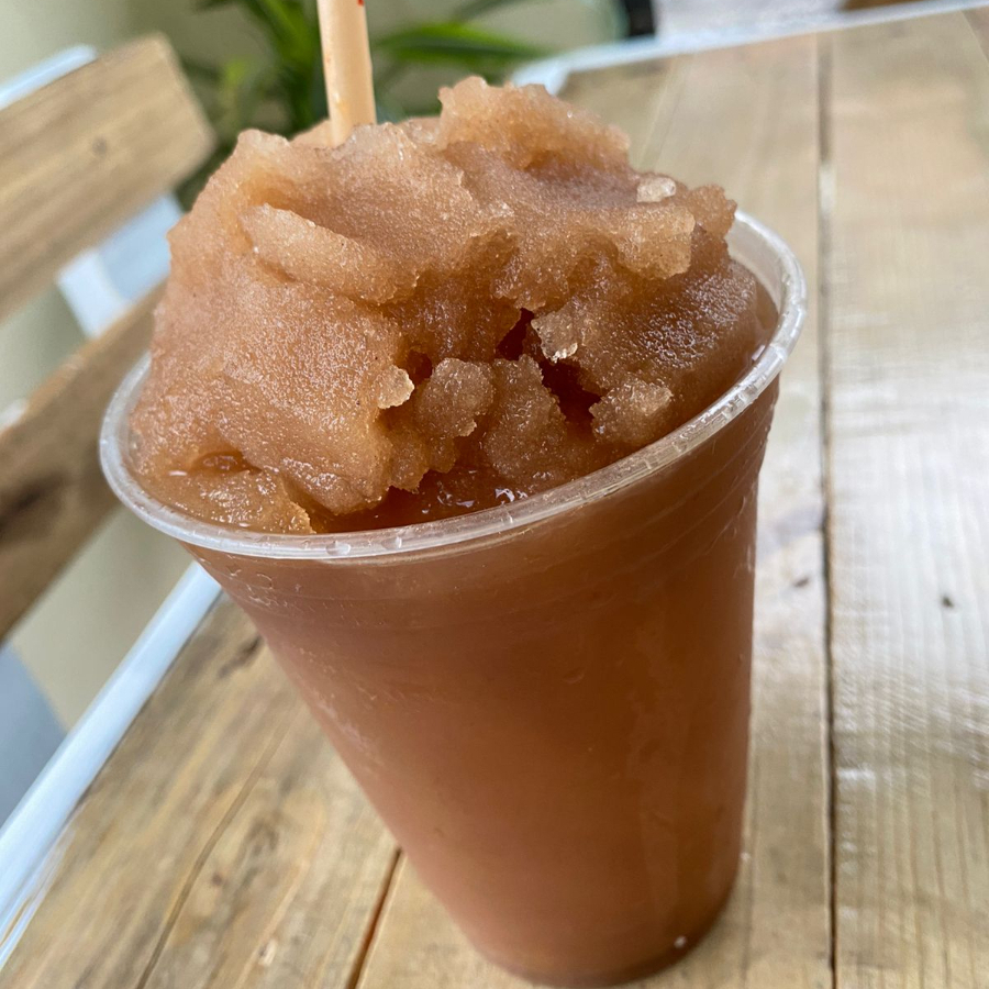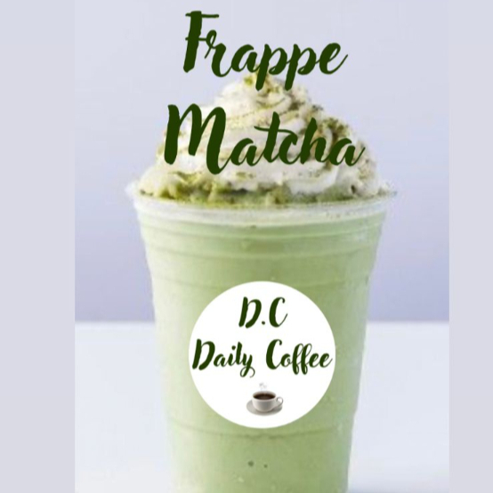 Frappe con leche, polvo de matcha, crema batida y galleta de chocolate