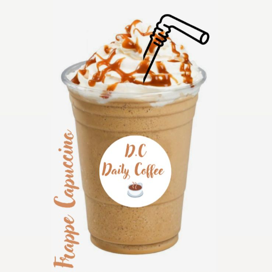Frappe de carga de cafe con puff de vainilla, con crema batida y galleta de chocolate