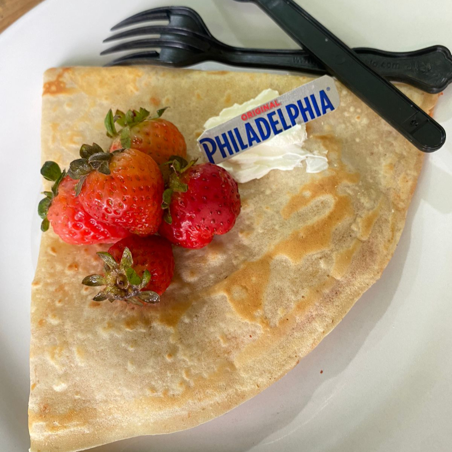 Deliiciosa crepa elaborada con masa casera con fresas naturales y queso philadelphia