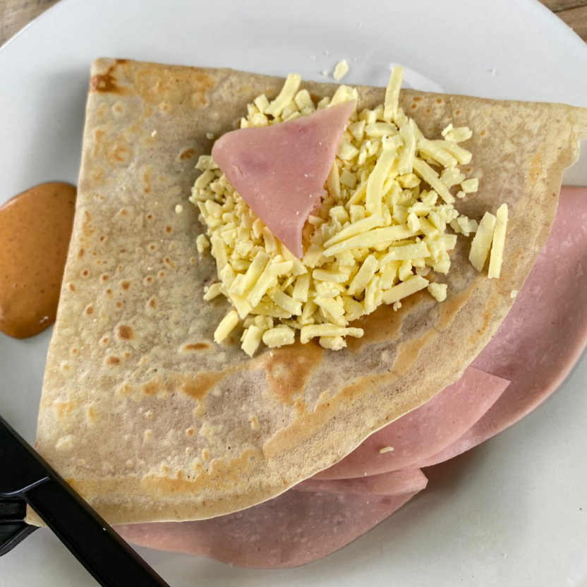 Deliciosa Crepa elaborada con masa casera, jamón de pavo y queso manchego, Acompañada con aderezo de chipotle