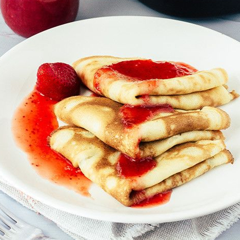 Deliciosa crepa elaborada con masa casera con mermelada de fresa natural