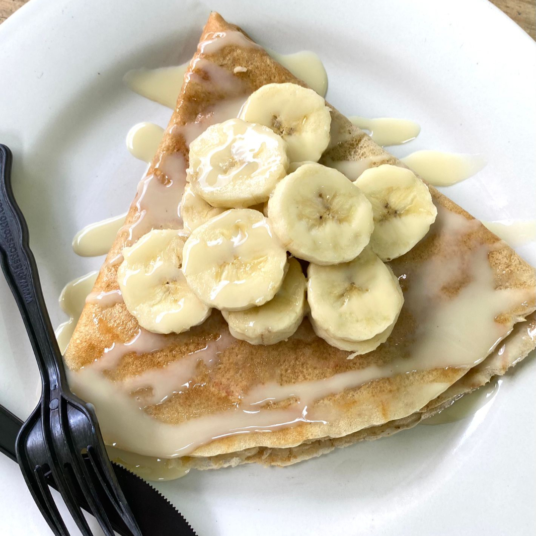 Deliciosa Crepa elaborada con masa casera, rebanadas de plátano y lechera.