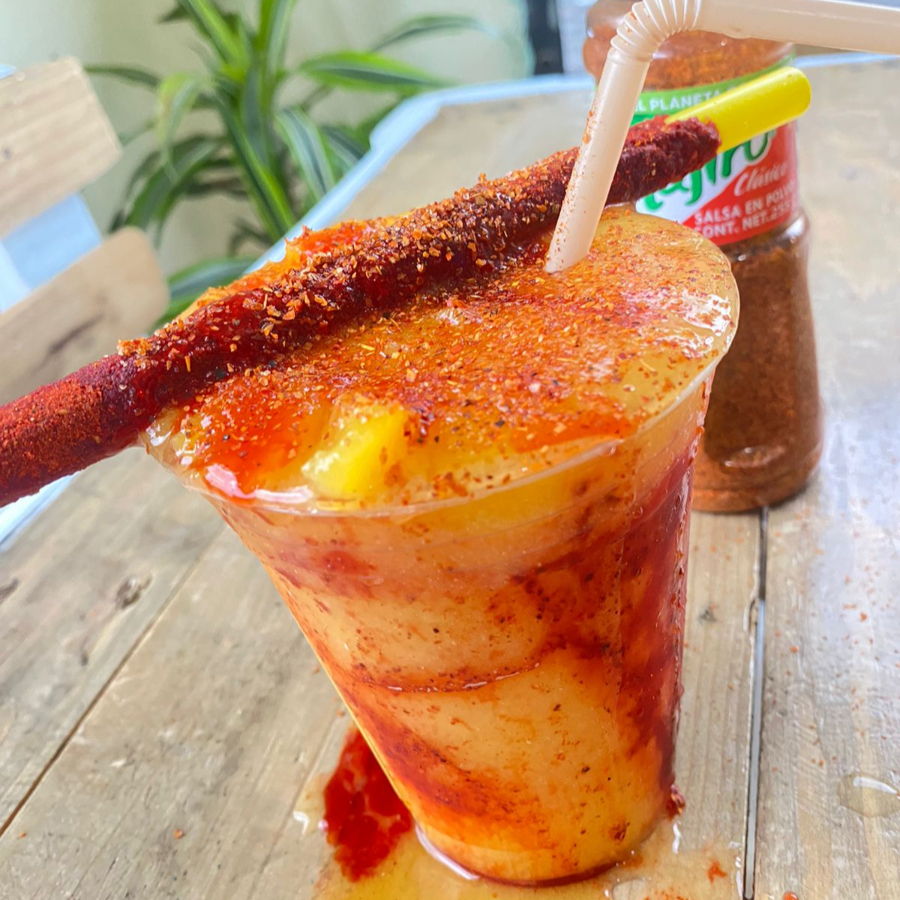 Diablito de pulpa de mango natural con chamoy, tajin y un tarugo de tamarindo