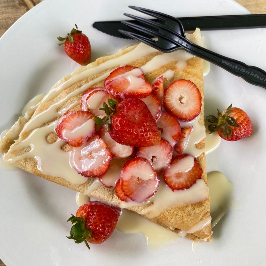 Deliciosa crepa elaborada con fresas naturales y lechera