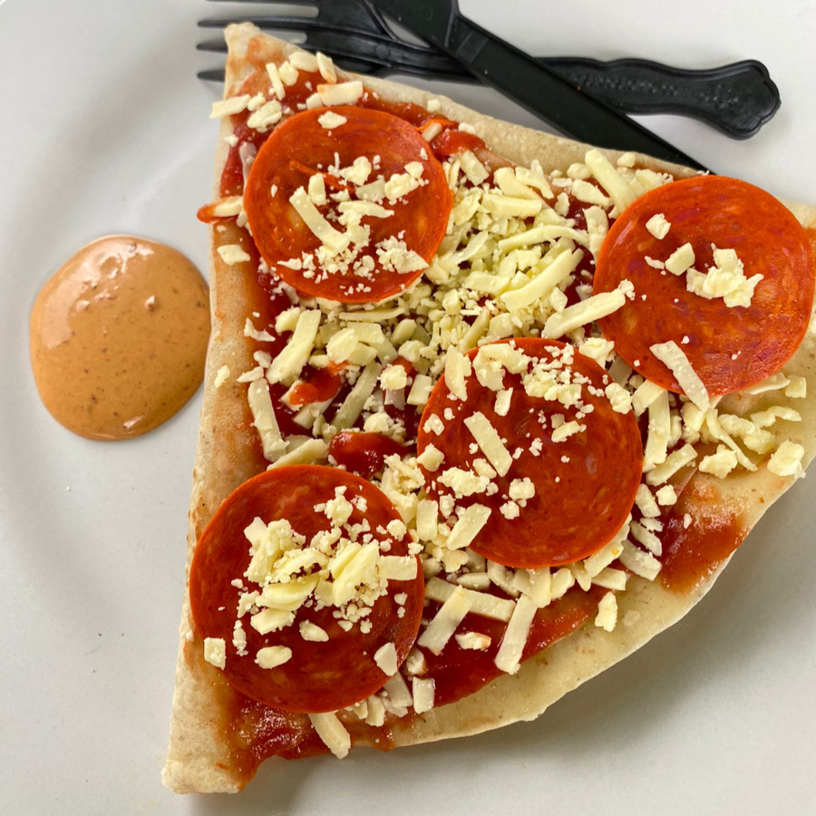 Deliciosa Crepa elaborada con masa casera, salsa de tomate, queso manchego y peperoni frito, Acompañado de aderezo de chipotle
