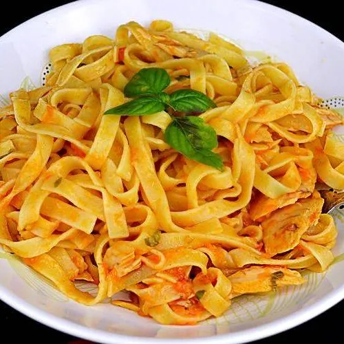 Fetuccine en salsa (pesto) de albahaca, piñón, nuez, ajo, cebolla, con topping de pollo a la plancha.