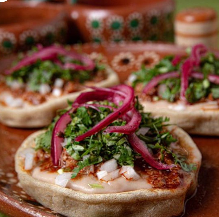 Sope con frijoles, birria, lechuga, crema y queso.