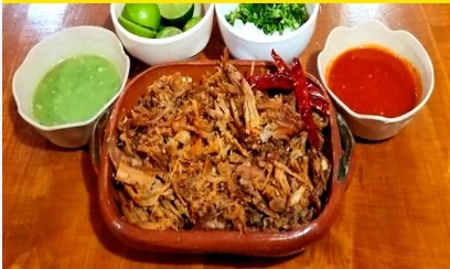 Totopos cocinados en salsa roja con crema, queso fresco, cebolla morada y agaucate.