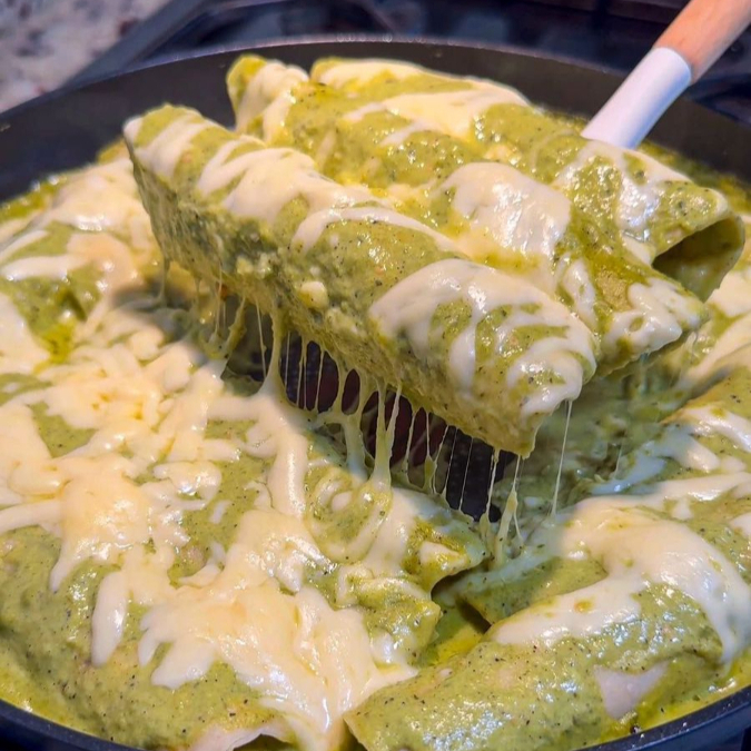 Cuatro enchiladas rellenas de pollo bañadas de salsa verde cremosa y queso cheester gratinado, adornado con cebolla y un poco de cilantro.