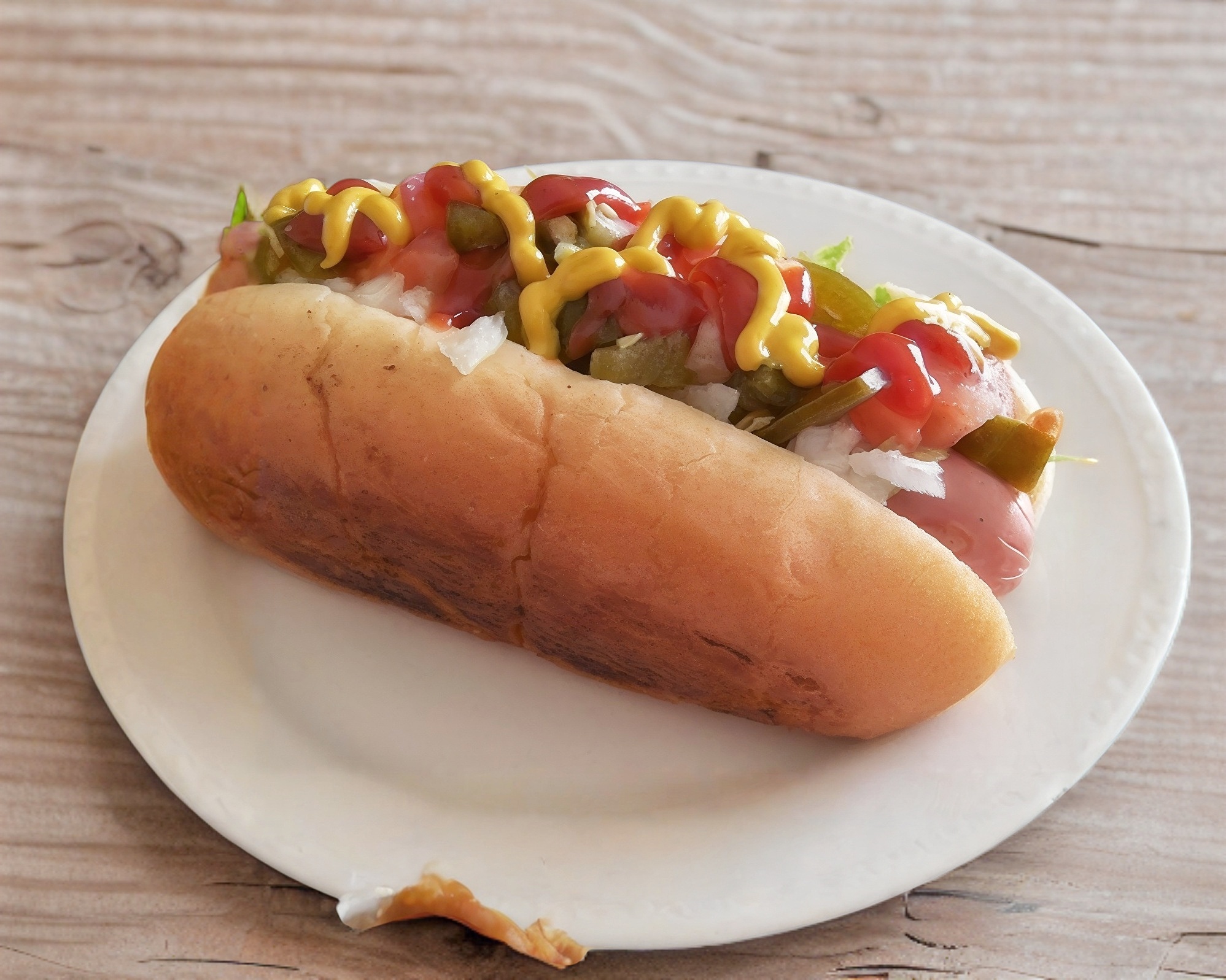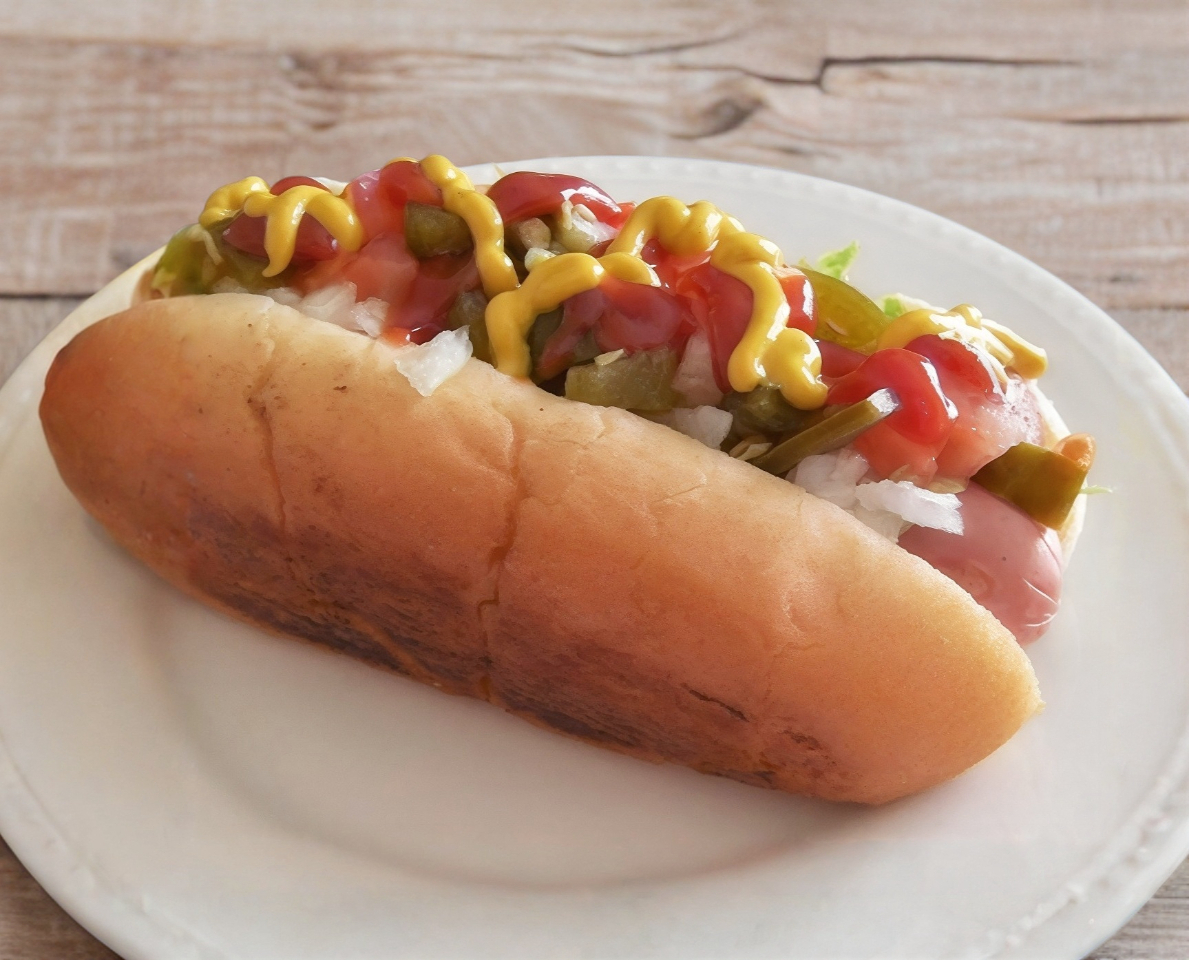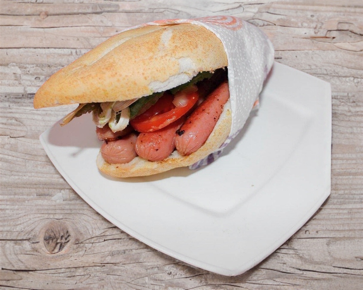 Doble salchicha de pavo, jitomate, lechuga verdura en vinagre, crema y aderezo.