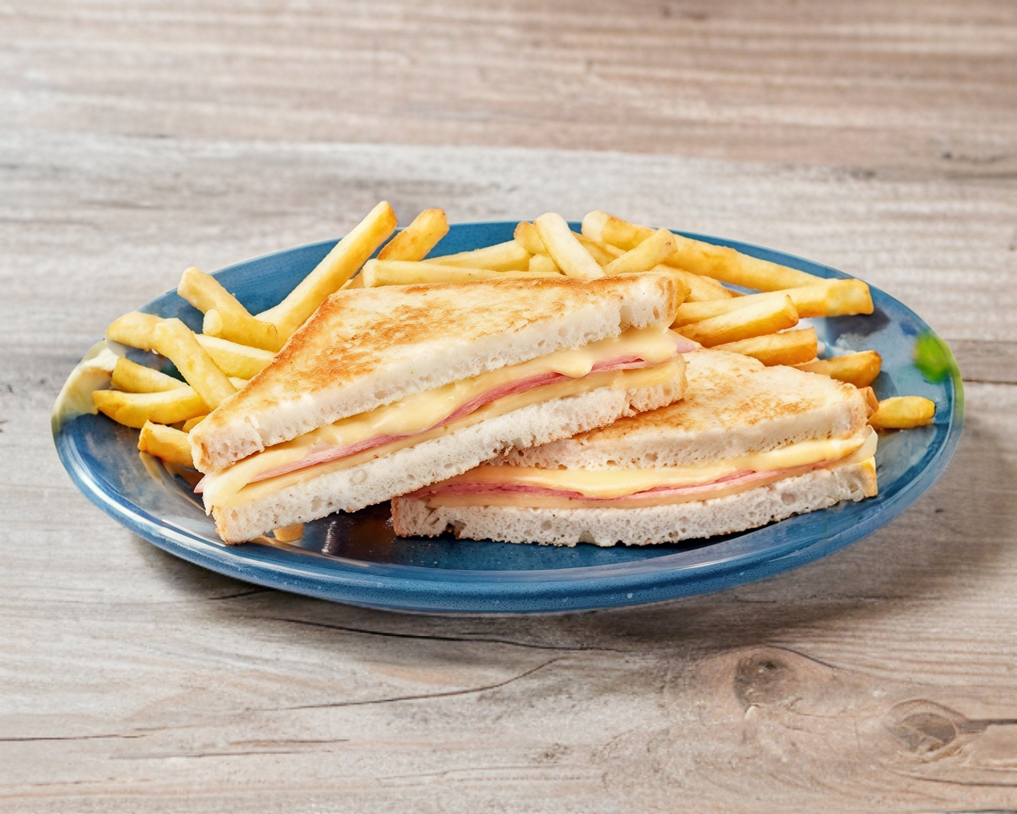 2 sándwiches de jamón de pavo, queso amarillo y papas a la francesa