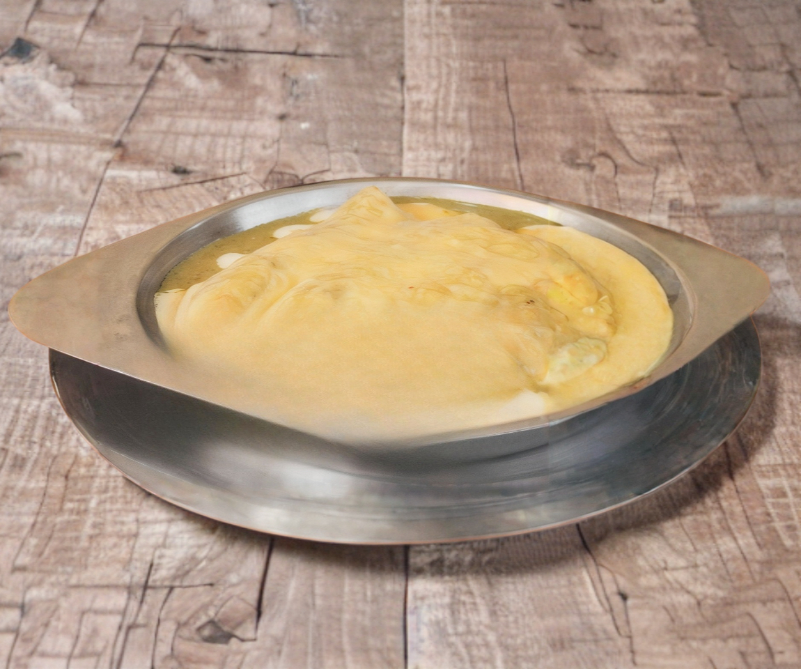 Tortilla de maíz o de harina, salsa verde de la casa no picante, rellenas de pollo, crema y gratinadas con queso.