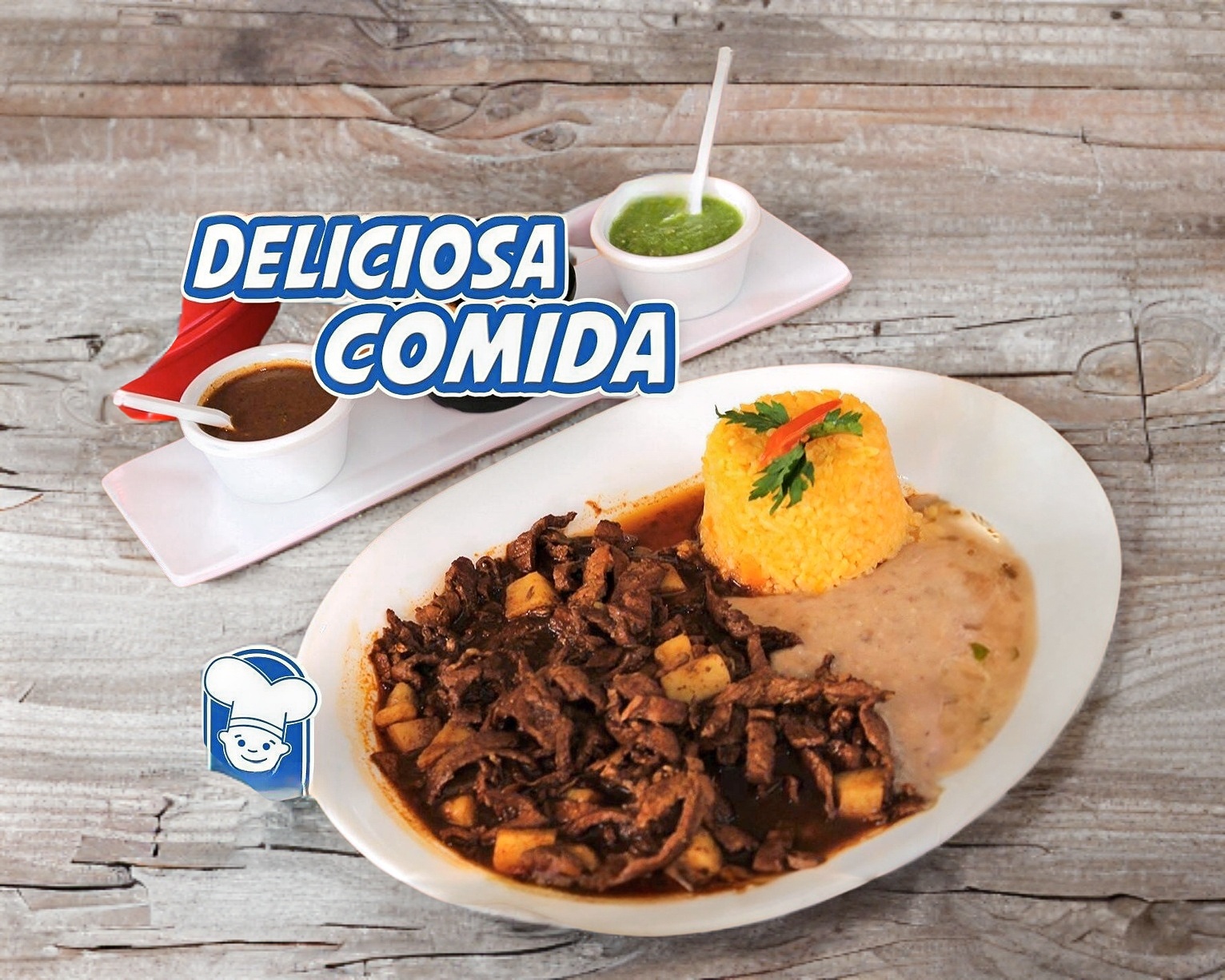 Puedes escoger entre cuatro guisados y de guarnición lleva arroz y frijoles, tortilla o bolillo