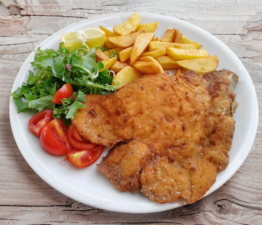 Milanesa empanizada, jitomate, lechuga verdura en vinagre, crema y aderezo de la casa (opcional salsa).