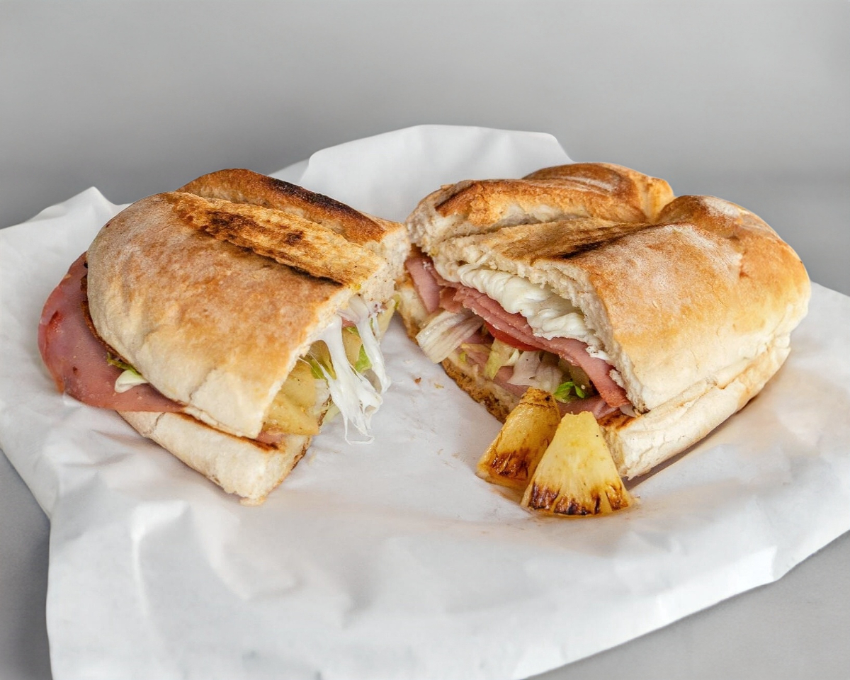 Jamon, Queso Oaxaca y piña (almíbar) asada. Todos nuestros productos llevan: Lechuga, Jitomate, Aguacate, Jalapeño, Mayonesa y un poco de salsa roja.