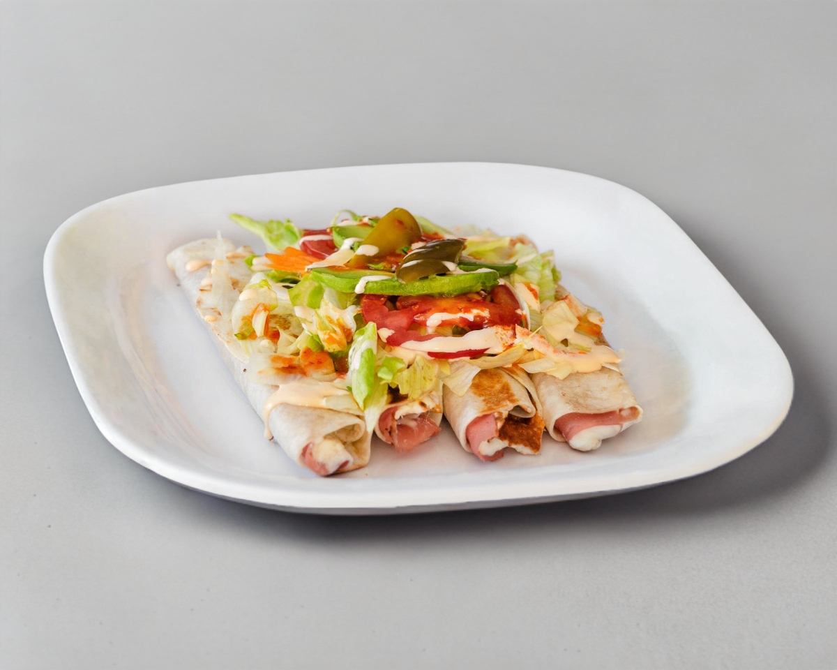 Los burritos son de tortilla de harina y en su interior rellenos de un delicioso Queso Oaxaca y salchicha de pavo. Acompañados de Lechuga, Jitomate, Guacamole, Jalapeño, Mayonesa y un poco de salsa roja.