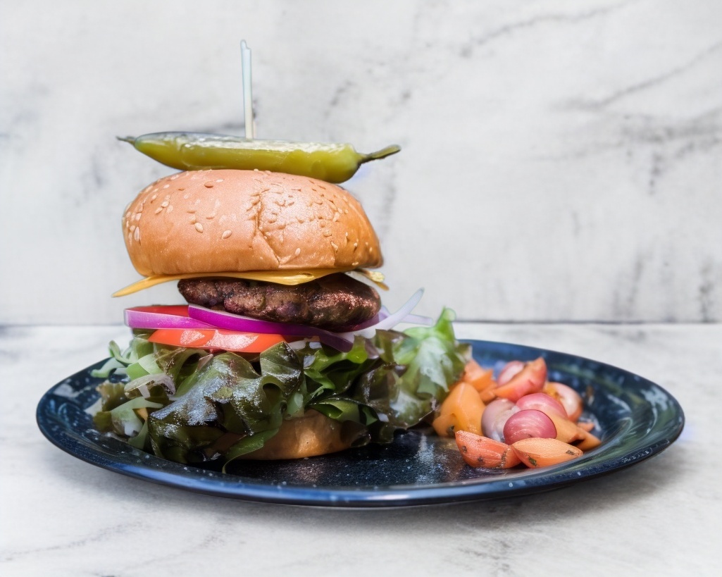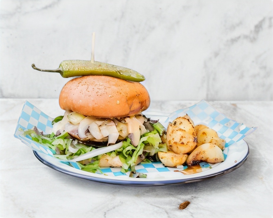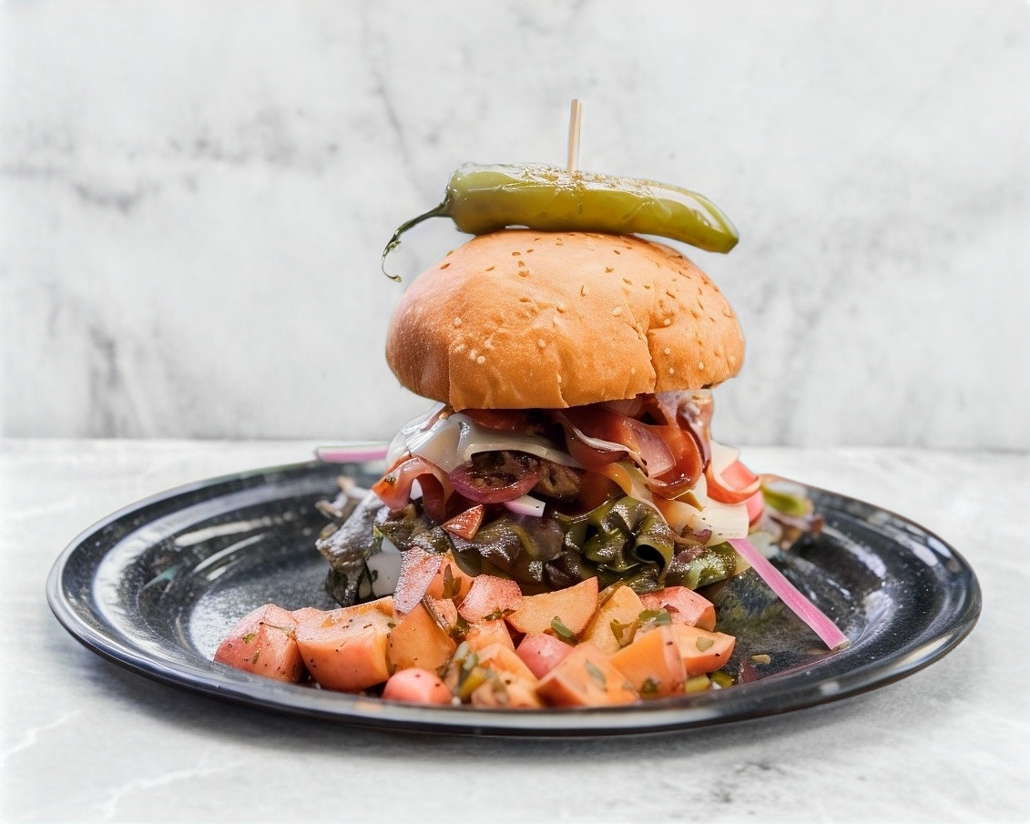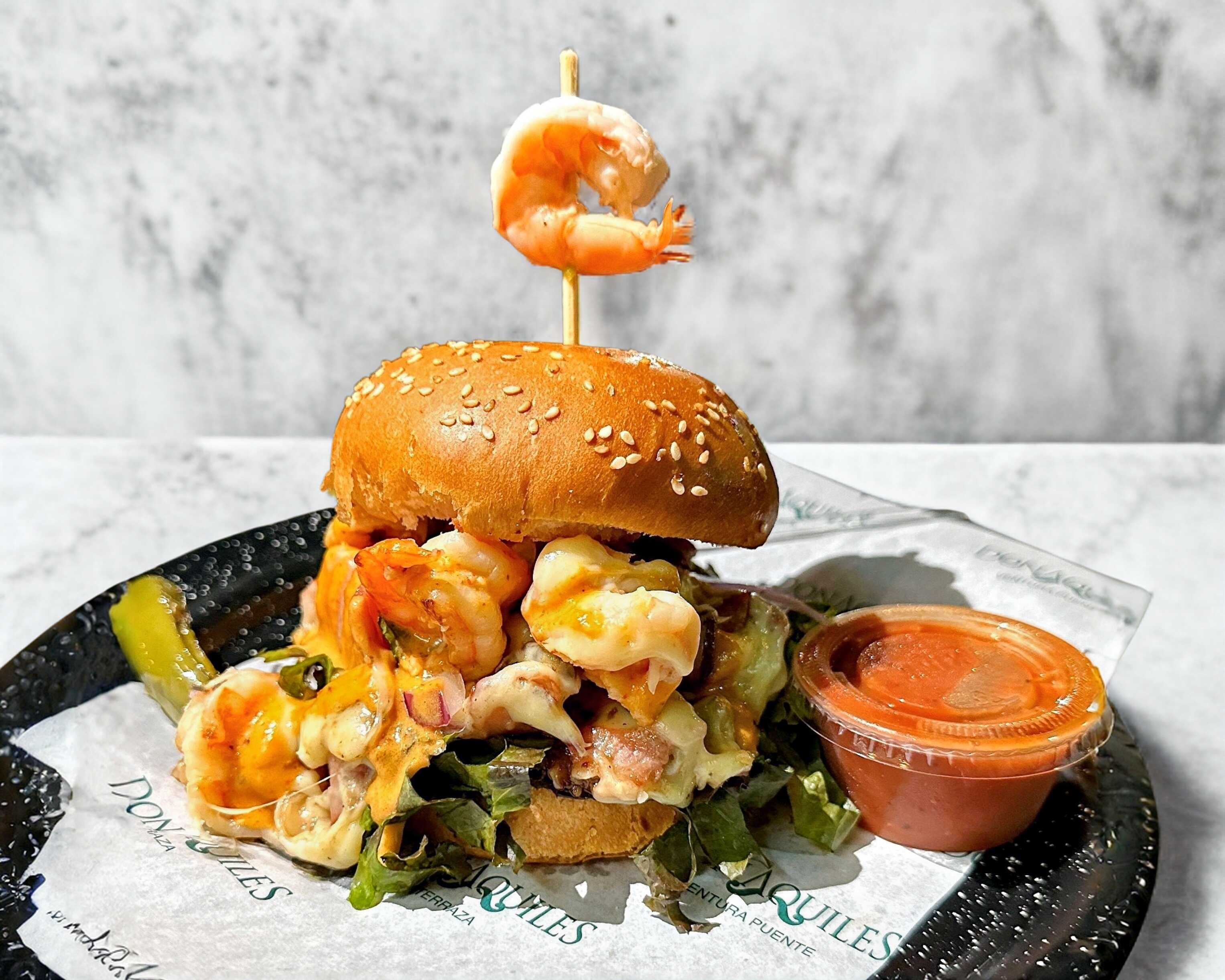 Doble carne de sirloin, con mix de piña, habanero y cebolla, jamón y queso manchego.