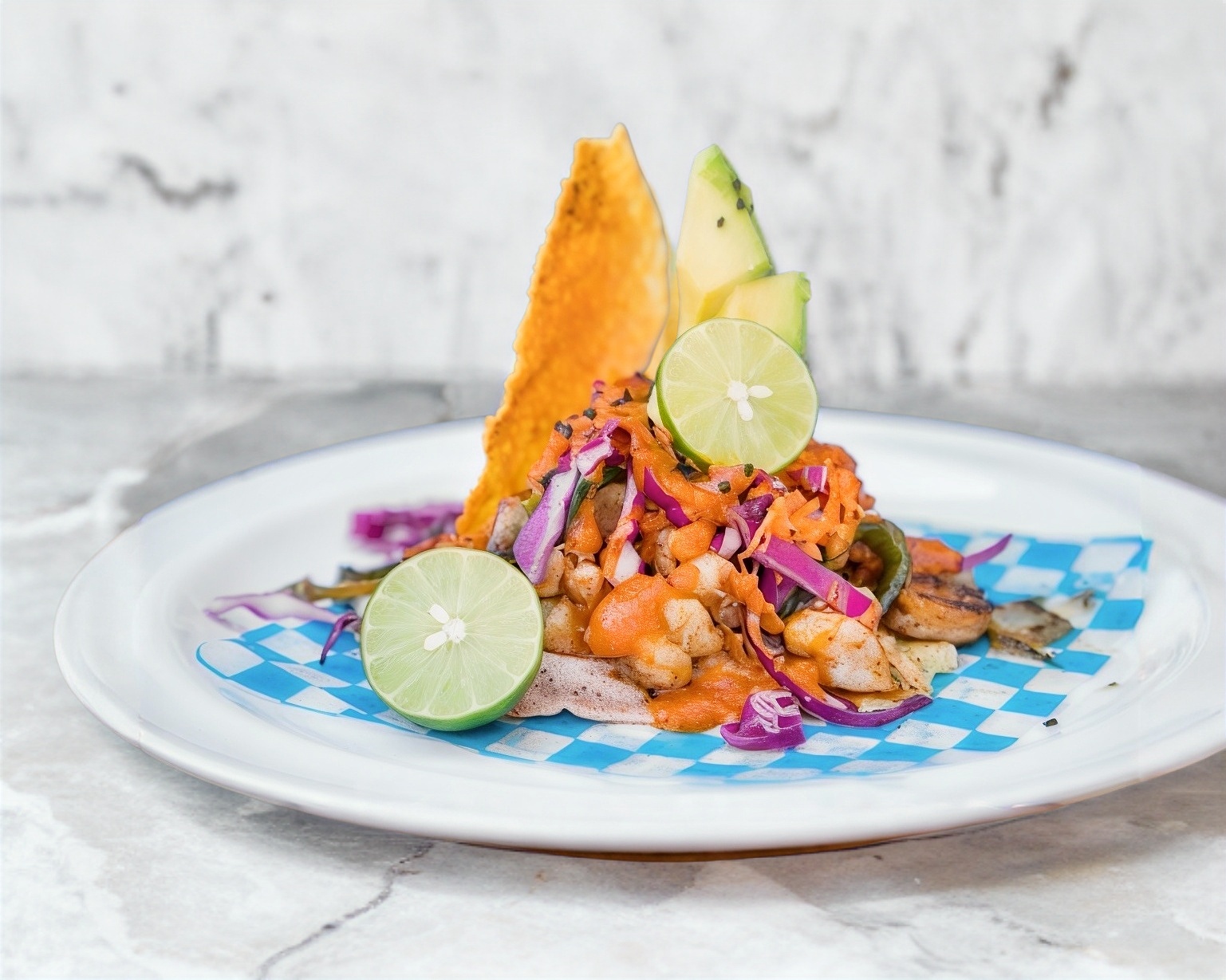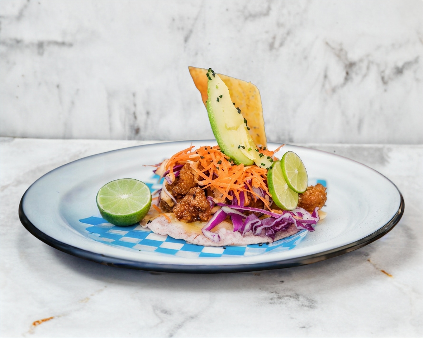 Tortilla de maíz, camarón empanizado, queso gouda, repollo, zanahoria y crema chipotle.