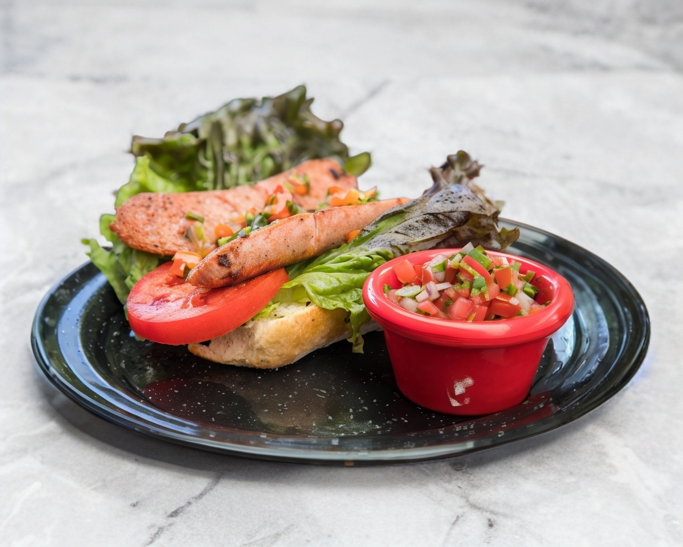 Chorizo argentino, bolillo, jitomate, lechuga y cebolla.