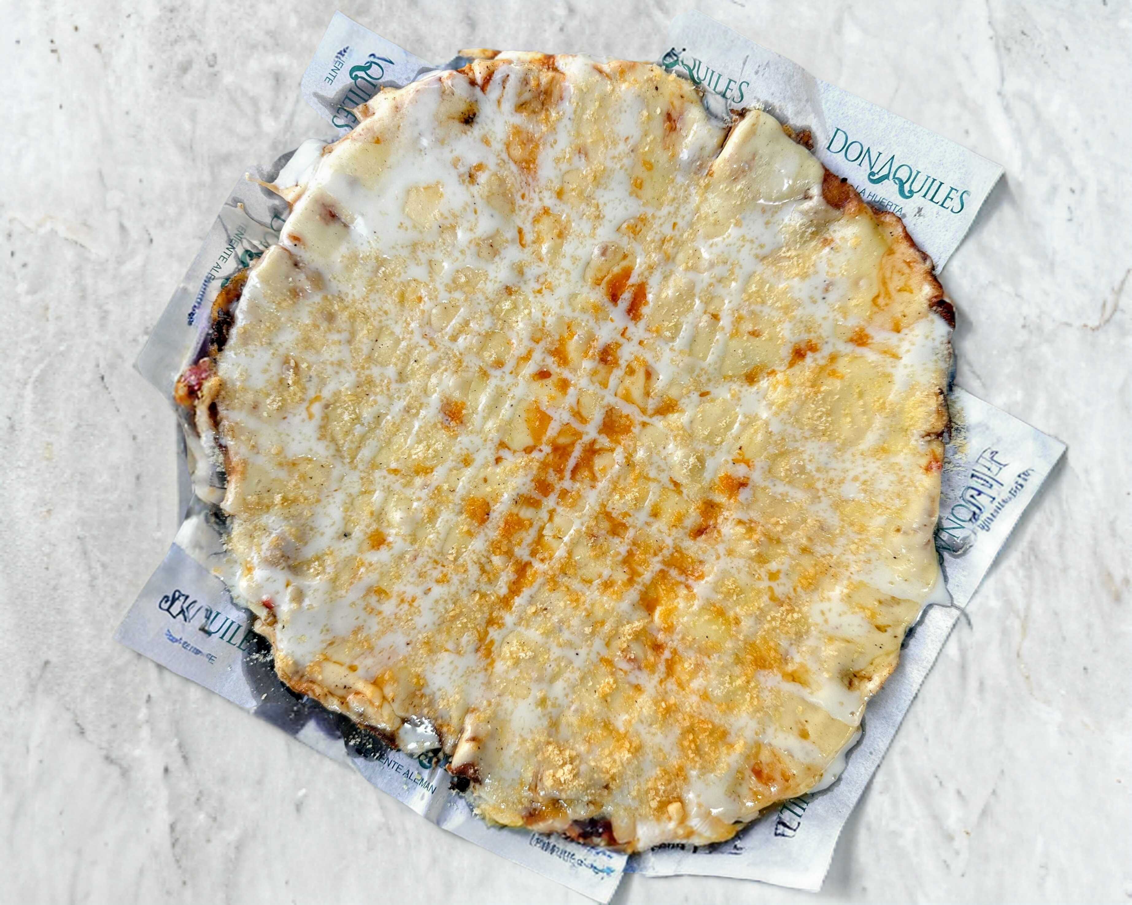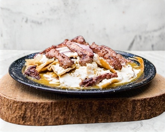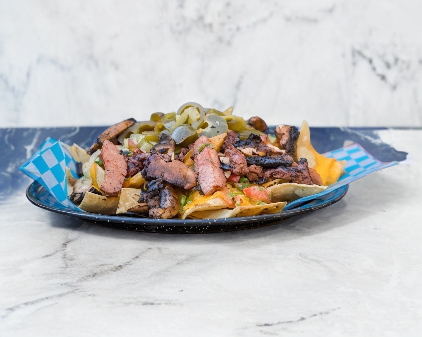 Totopos, queso cheddar, arrachera a la plancha, chorizo tradicional, pico de gallo y jalapeños.