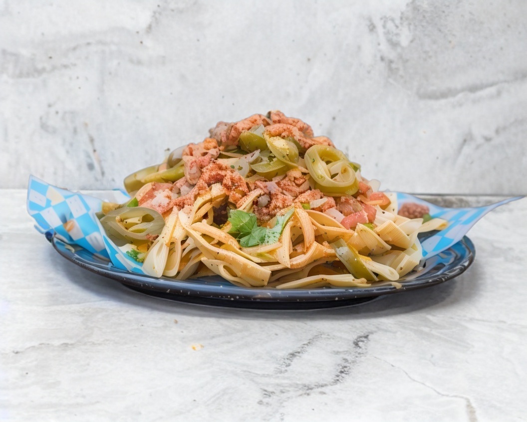 Tortilla de maíz, camarón, queso gouda y rajas poblanas.