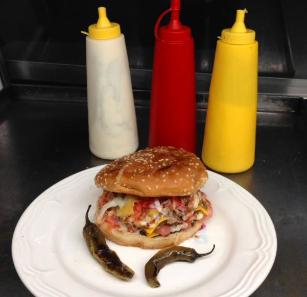 Nuestra deliciosa hamburguesa con 1 carne, salchicha, queso asadero, piña, tocino, jitomate, lechuga, cebolla y liquidos.