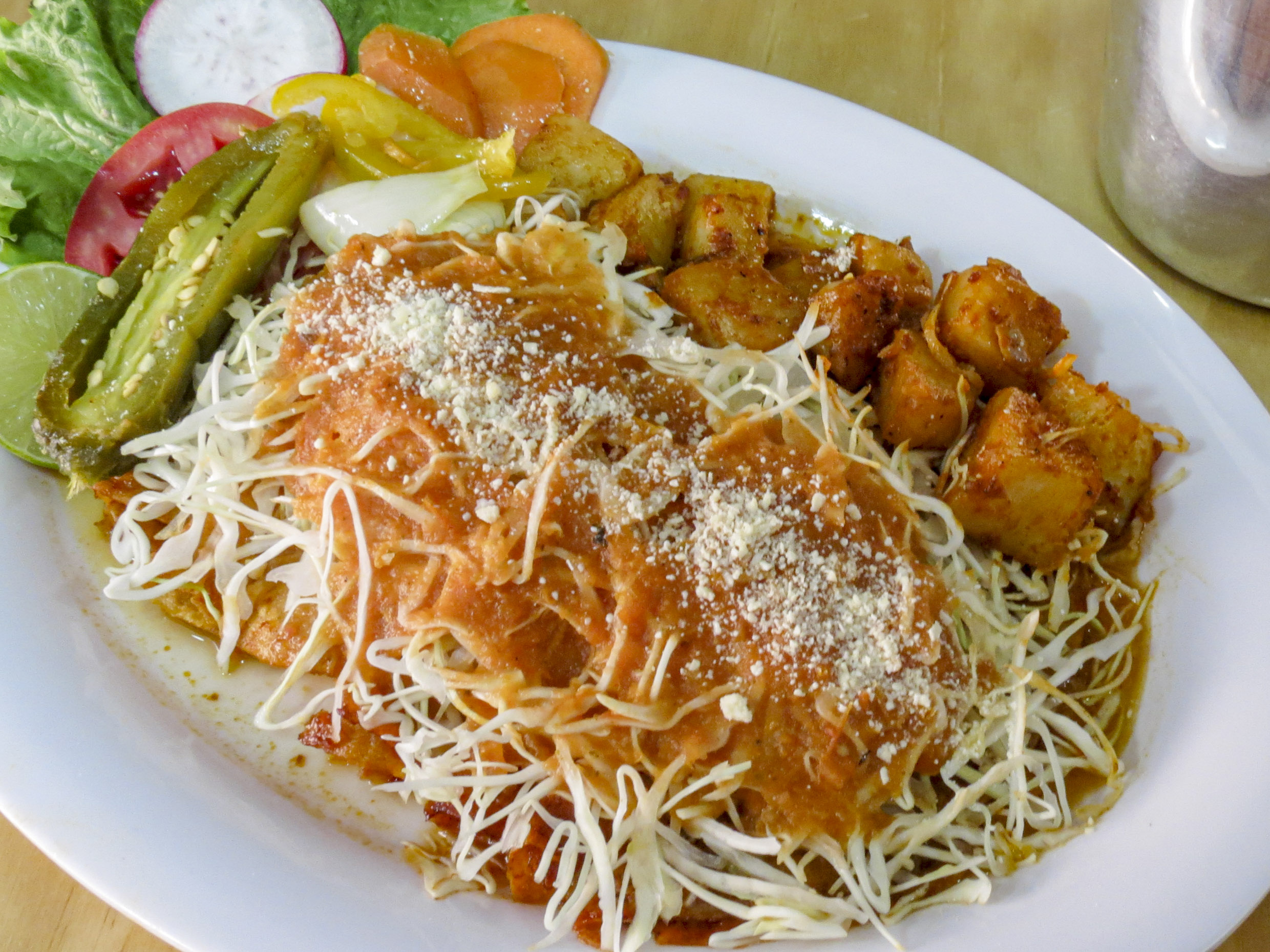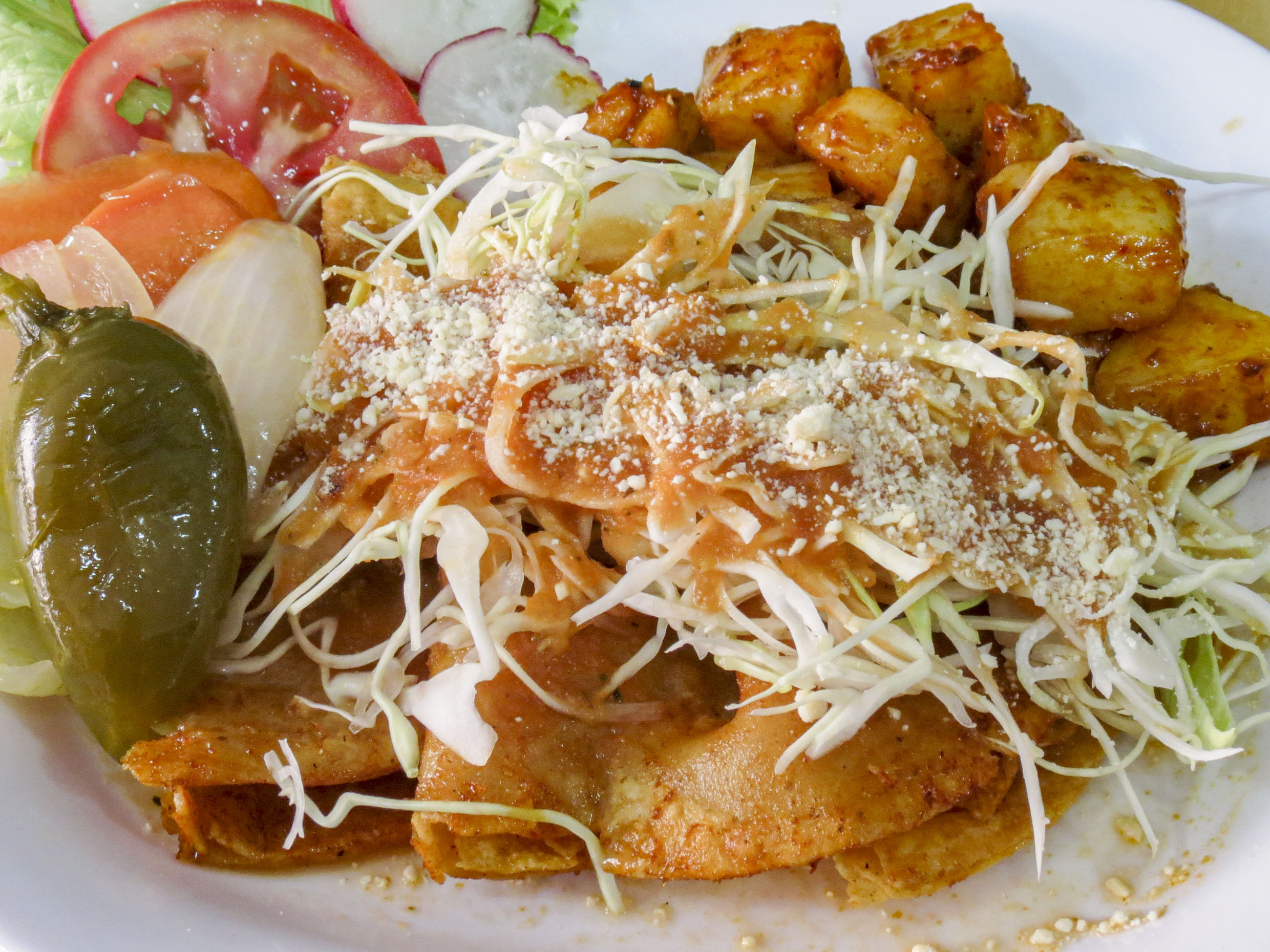 Platillo personal: orden de 6 enchiladas sencillas, rellenas de queso fresco y cebolla picada, acompañadas de repollo, lechuga, jitomate, rábano y papitas adobadas, con salsa de la casa y un toque de queso seco por encima.