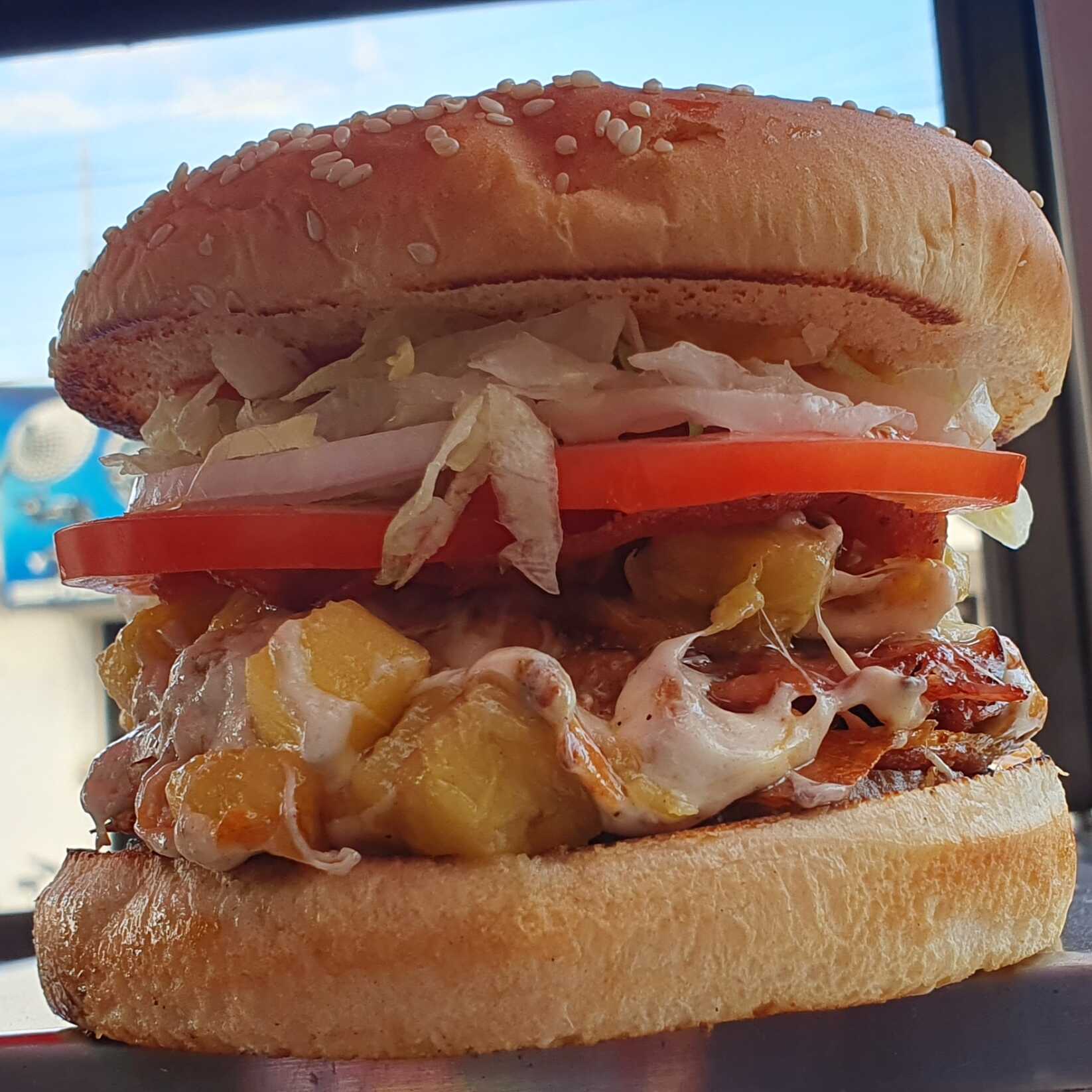 Hamburguesa con Carne, piña, queso Oaxaca, tocino, salchicha, doble jamón, queso amarillo, jitomate, lechuga, cebolla, catsup, mayonesa, mostaza.