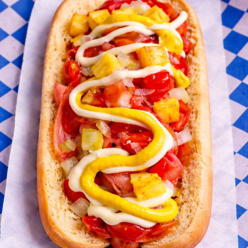 Salchicha, jamón, tocino, jitomate, cebolla, cátsup, mayonesa, mostaza.
