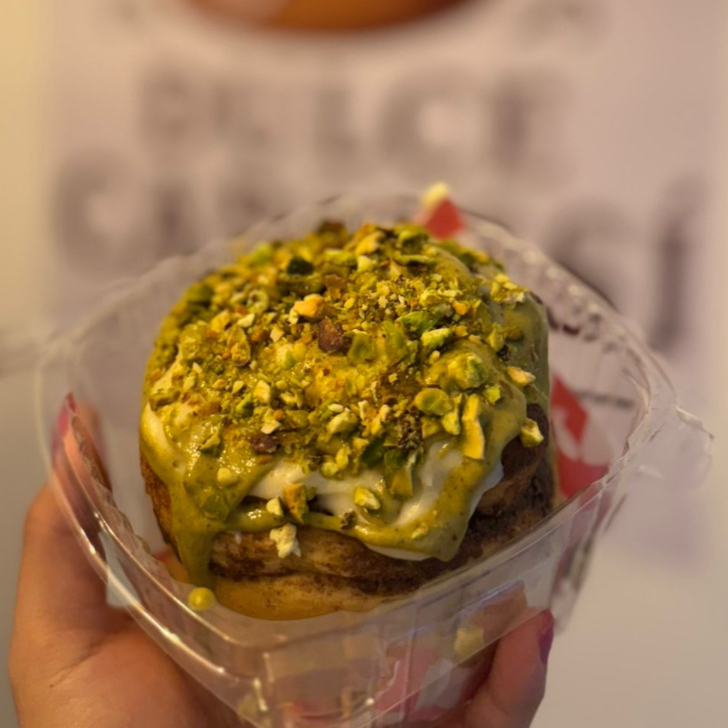 Glaseado, crema de pistache y pistaches tostados.