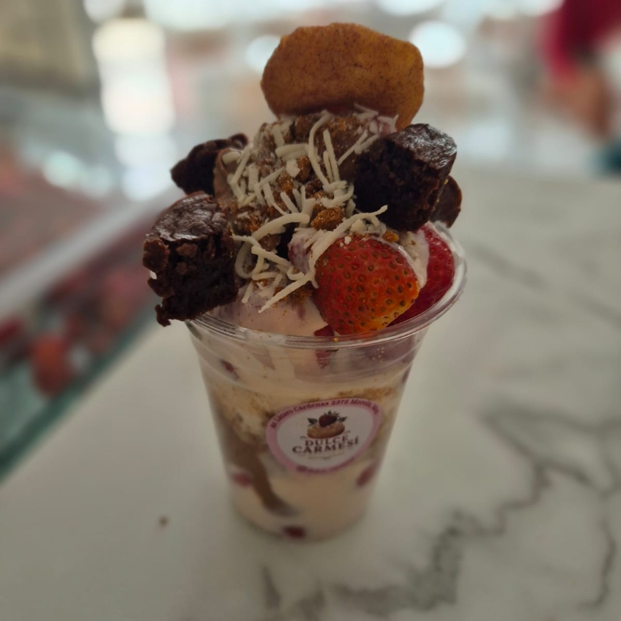 crema de su eleccion, una cobertura, dos toppings, medio brownie de chocolate y una rica donita de canela.