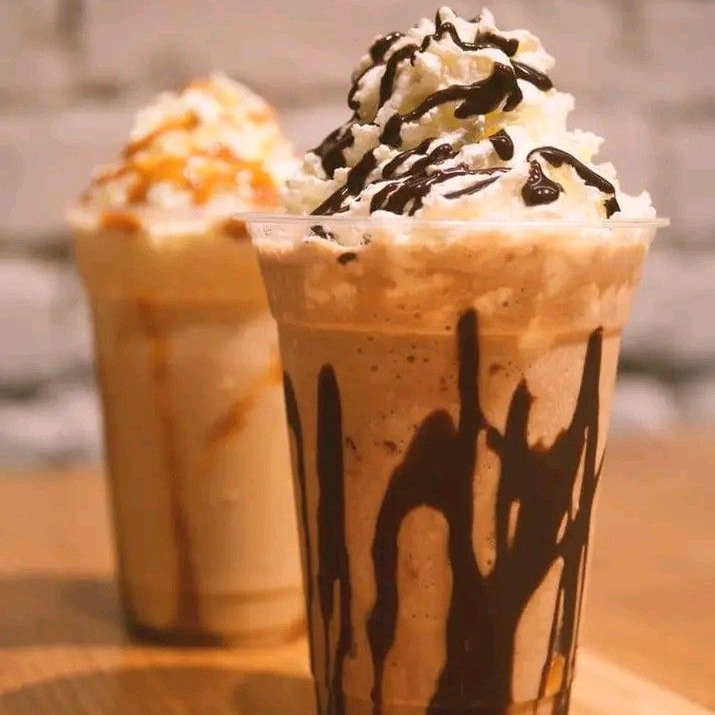 Frappe a base de café, leche y moka frío. Decorado con crema batida y hershie de chocolate.