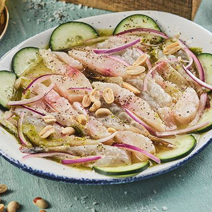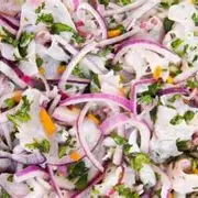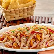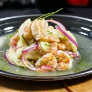 1/2 lt de aguachile en salsa de la casa con pepino, cebolla, aguacate y ajonjoli acompañado de tostadas, y salsa
