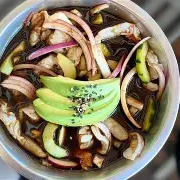 1/2 lt de aguachile en salsa negra con pepino, cebolla, aguacate y ajonjoli acompañado de tostadas, y salsa