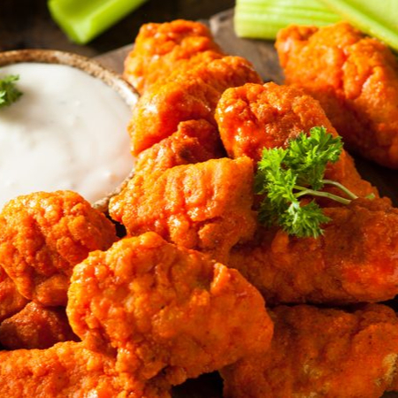 330gr de alitas de pollo bañadas en salsa buffalo acompañadas con verduras y aderezo