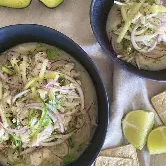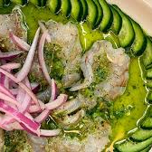1/2 lt de aguachile en salsa verde con pepino, cebolla, aguacate y ajonjoli acompañado de tostadas, y salsa
