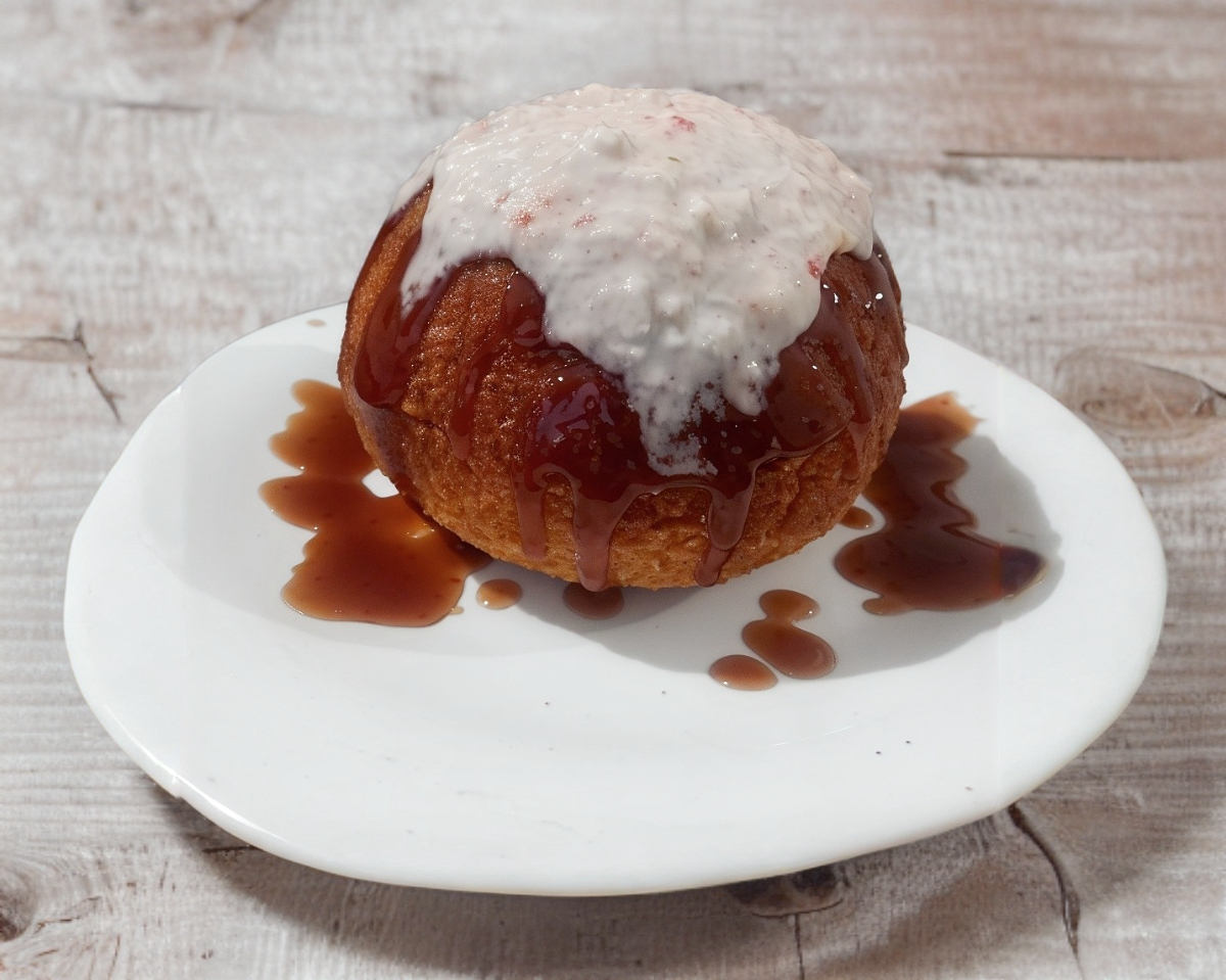 plátano relleno de queso filadelfia, empanizado y bañado en fresa o chocolate