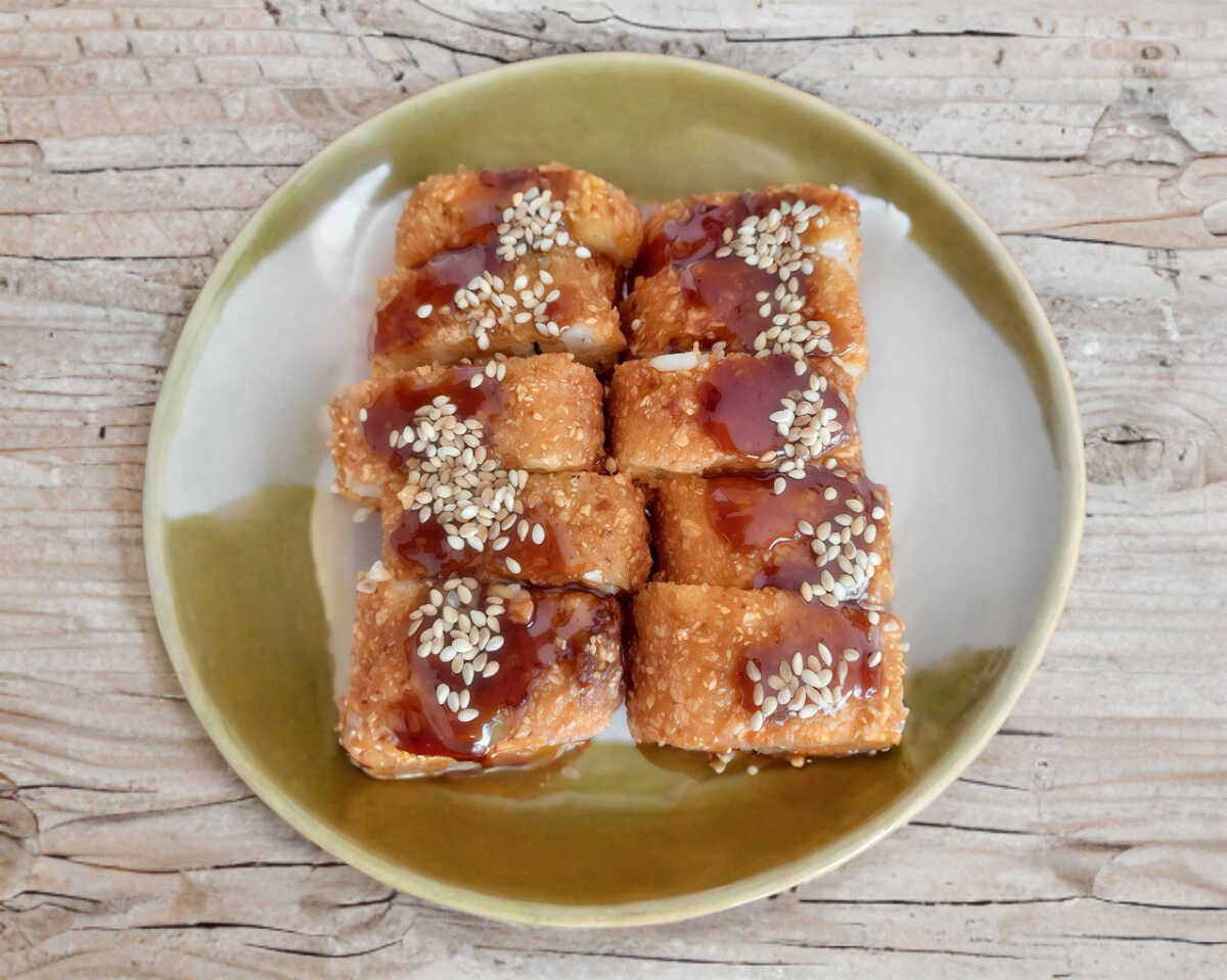 bolitas de arroz rellenas del ingrediente de tu elección, empanizadas y crujientes.